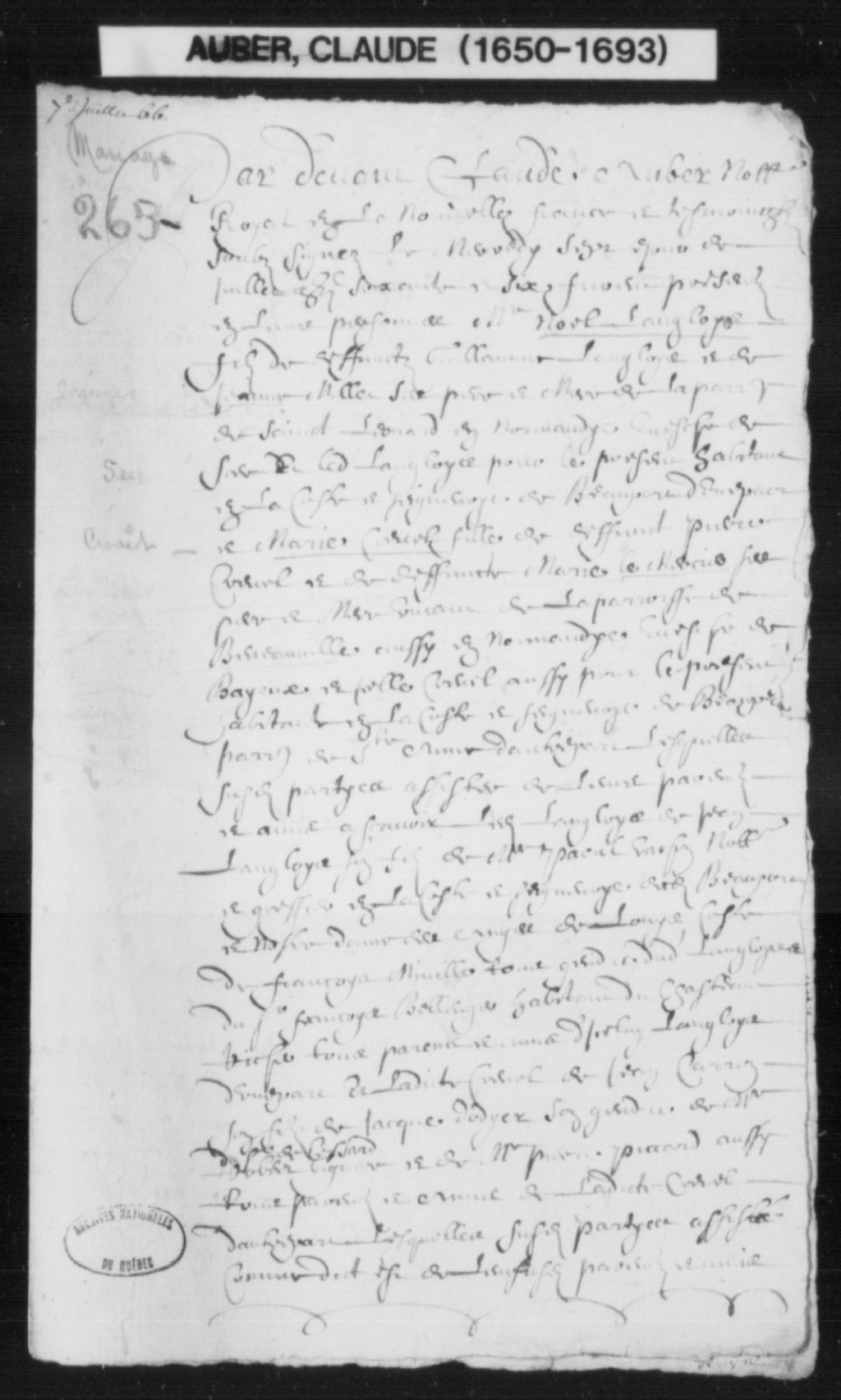 Claude Auber, 1650-1692, Archives nationales à Québec, Fonds Cour supérieure. District judiciaire de Québec. Greffes de notaires, (03Q,CN301,S4).