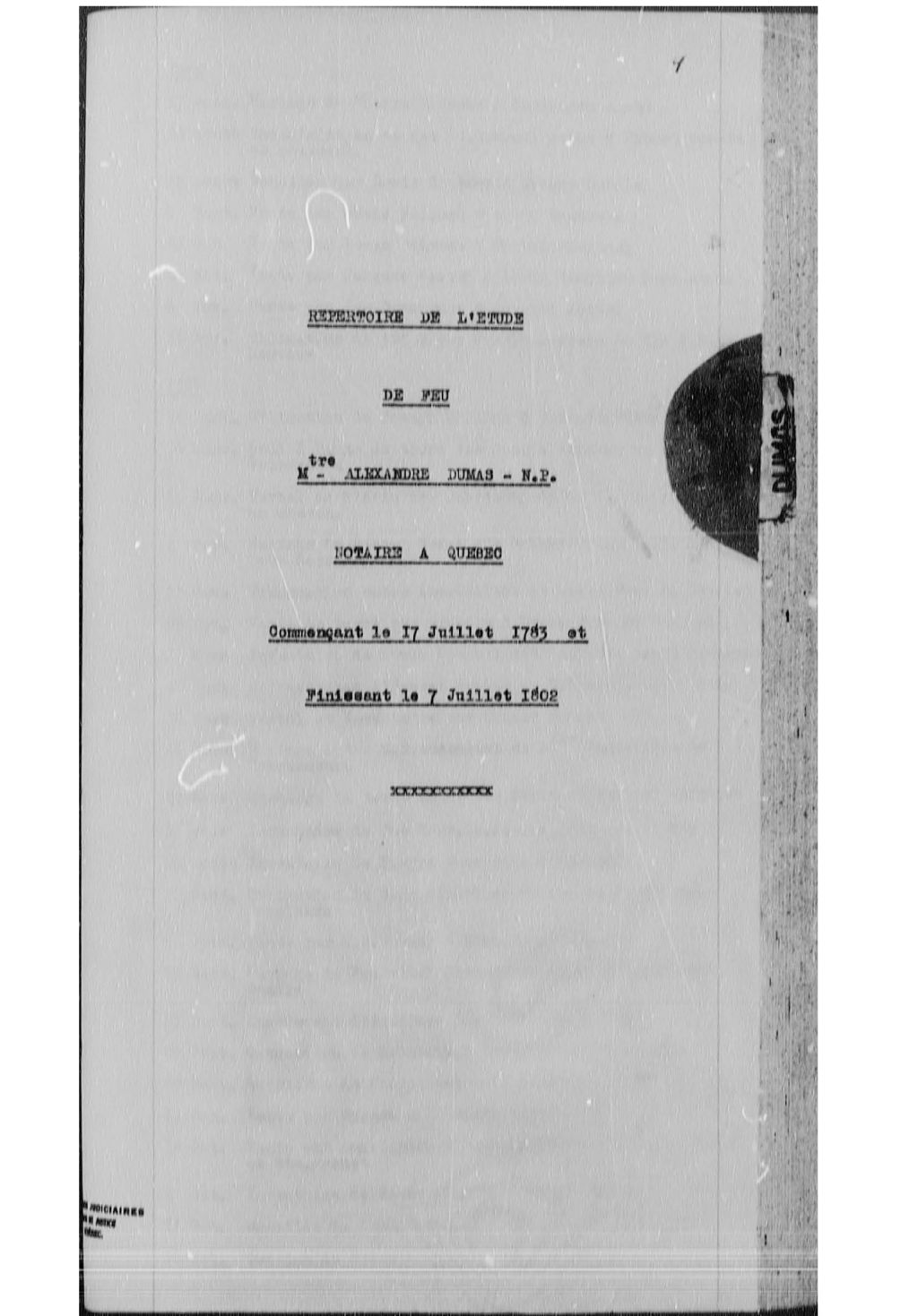 Alexandre Dumas a pratiqué le notariat à Trois-Rivières du 17 juillet 1783 au 20 août 1784 et à Québec du 2 septembre 1784 au 7 juillet 1802