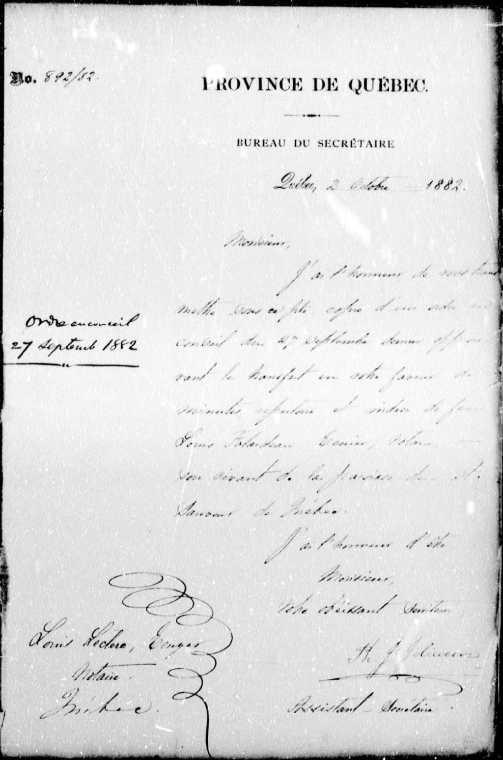 Louis Falardeau, 1851-1881, Archives nationales à Québec, Fonds Cour supérieure. District judiciaire de Québec. Greffes de notaires, (03Q,CN301,S98).