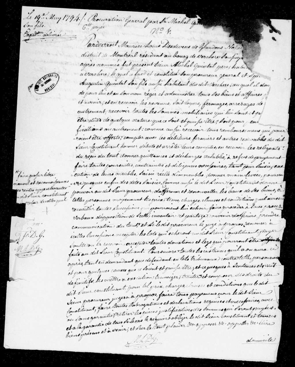 Maurice-Louis Desdevens de Glandon, 1794-1806, Archives nationales à Montréal, Fonds Cour supérieure. District judiciaire de Richelieu. Greffes de notaires, (06M,CN603,S31).