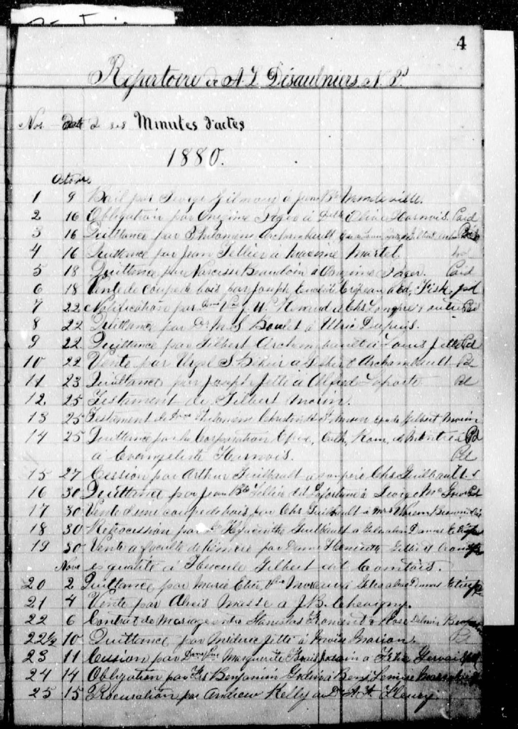 Almidas-Jacques-Théophile Desaulniers, 1880-1885, Archives nationales à Montréal, Fonds Cour supérieure. District judiciaire de Joliette. Greffes de notaires, (06M,CN605,S56).