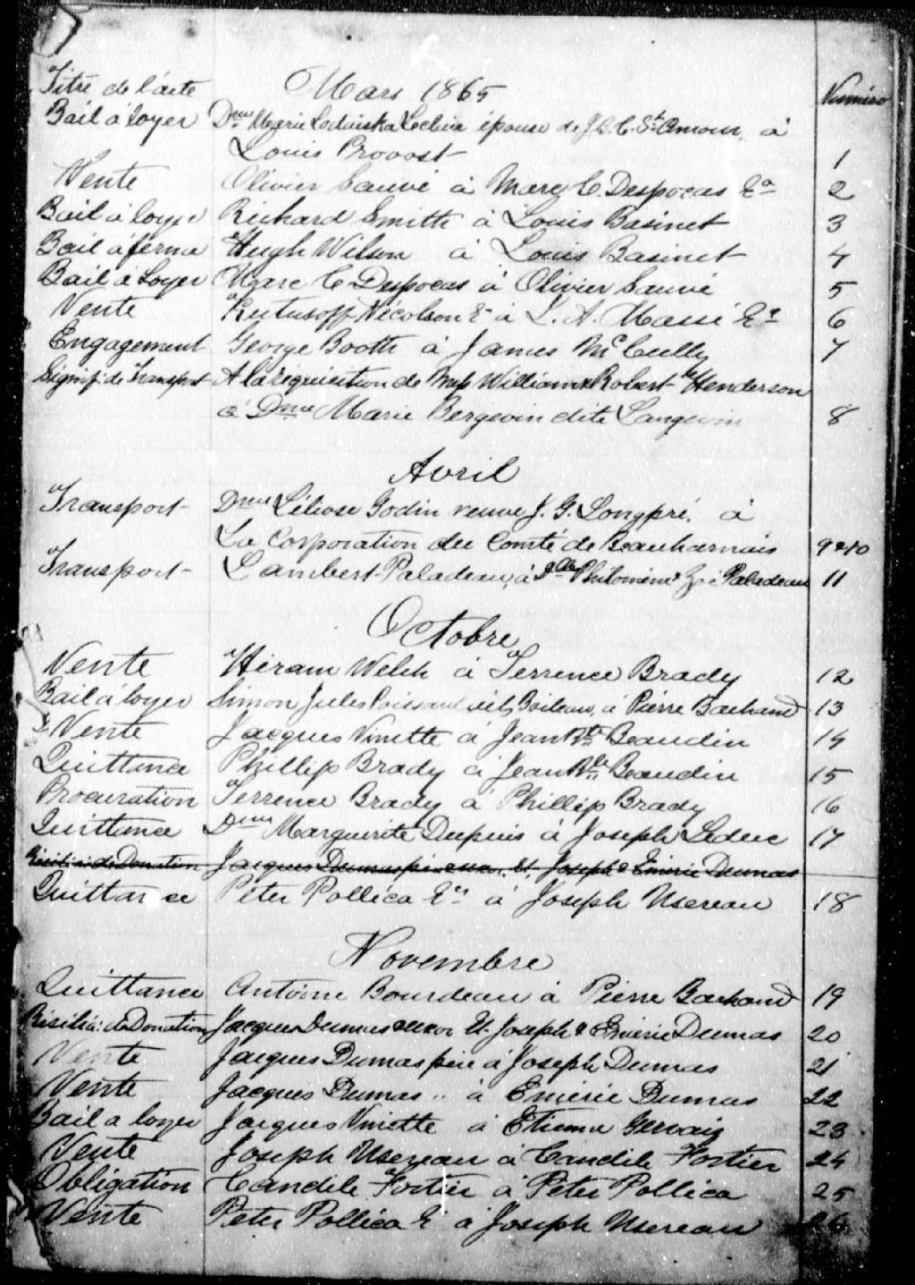 Cléophas Meunier, 1865-1876, Archives nationales à Montréal, Fonds Cour supérieure. District judiciaire de Beauharnois. Greffes de notaires, (06M,CN607,S39).