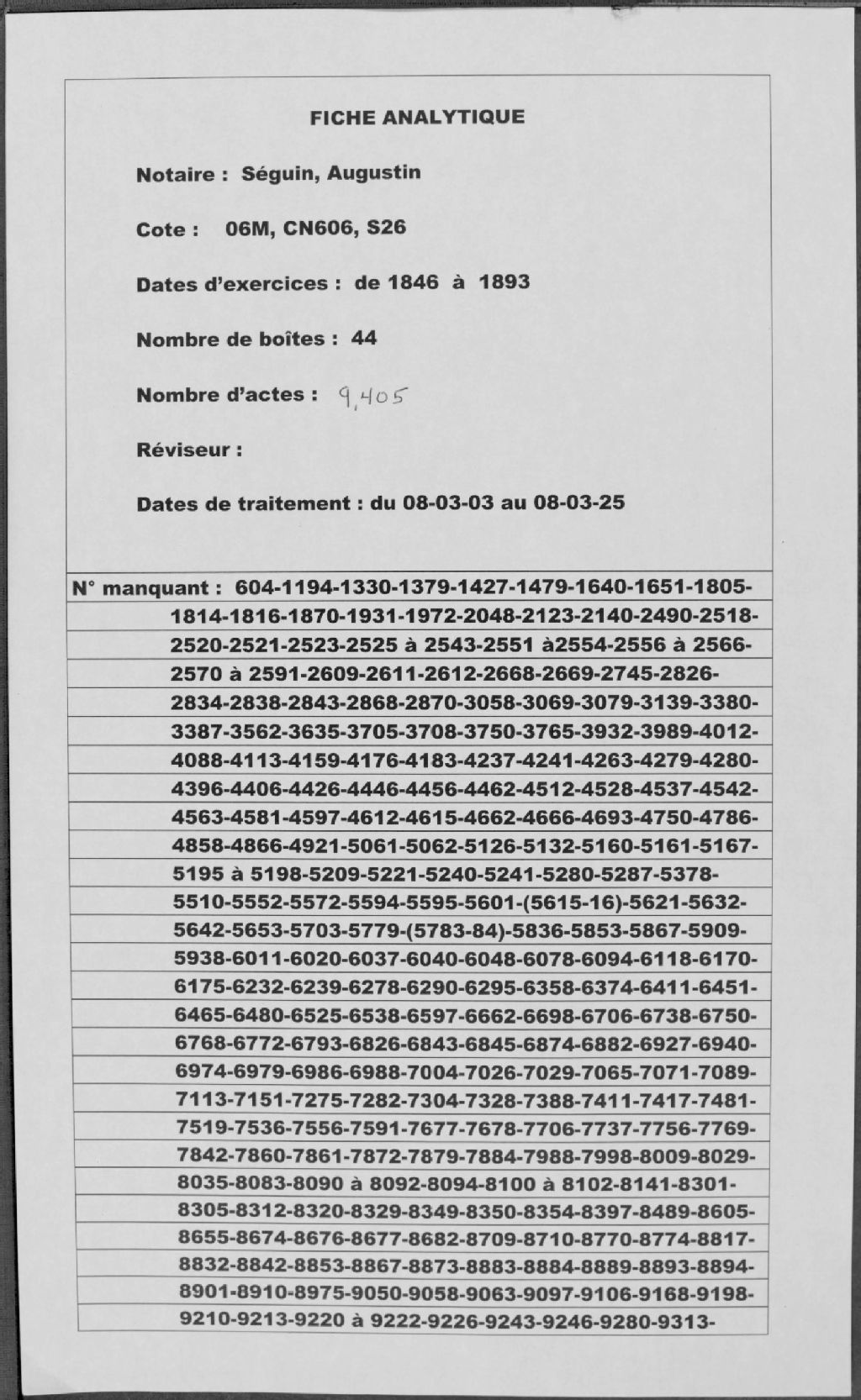 Augustin Séguin, 1846-1893, Archives nationales à Montréal, Fonds Cour supérieure. District judiciaire de Terrebonne. Greffes de notaires, (06M,CN606,S26).