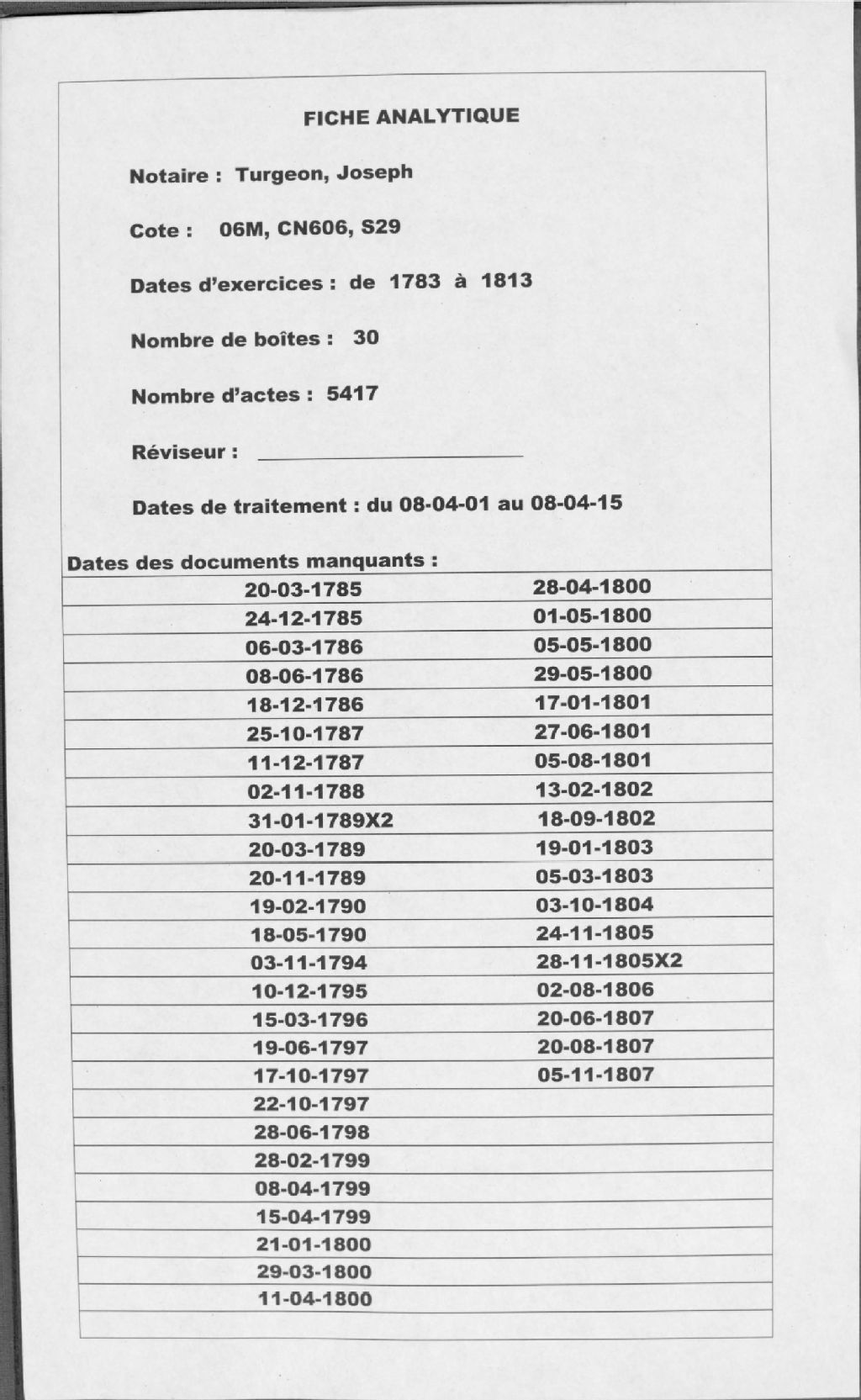 Joseph Turgeon, 1782-1813; surtout 1783-1808, Archives nationales à Montréal, Fonds Cour supérieure. District judiciaire de Terrebonne. Greffes de notaires, (06M,CN606,S29).