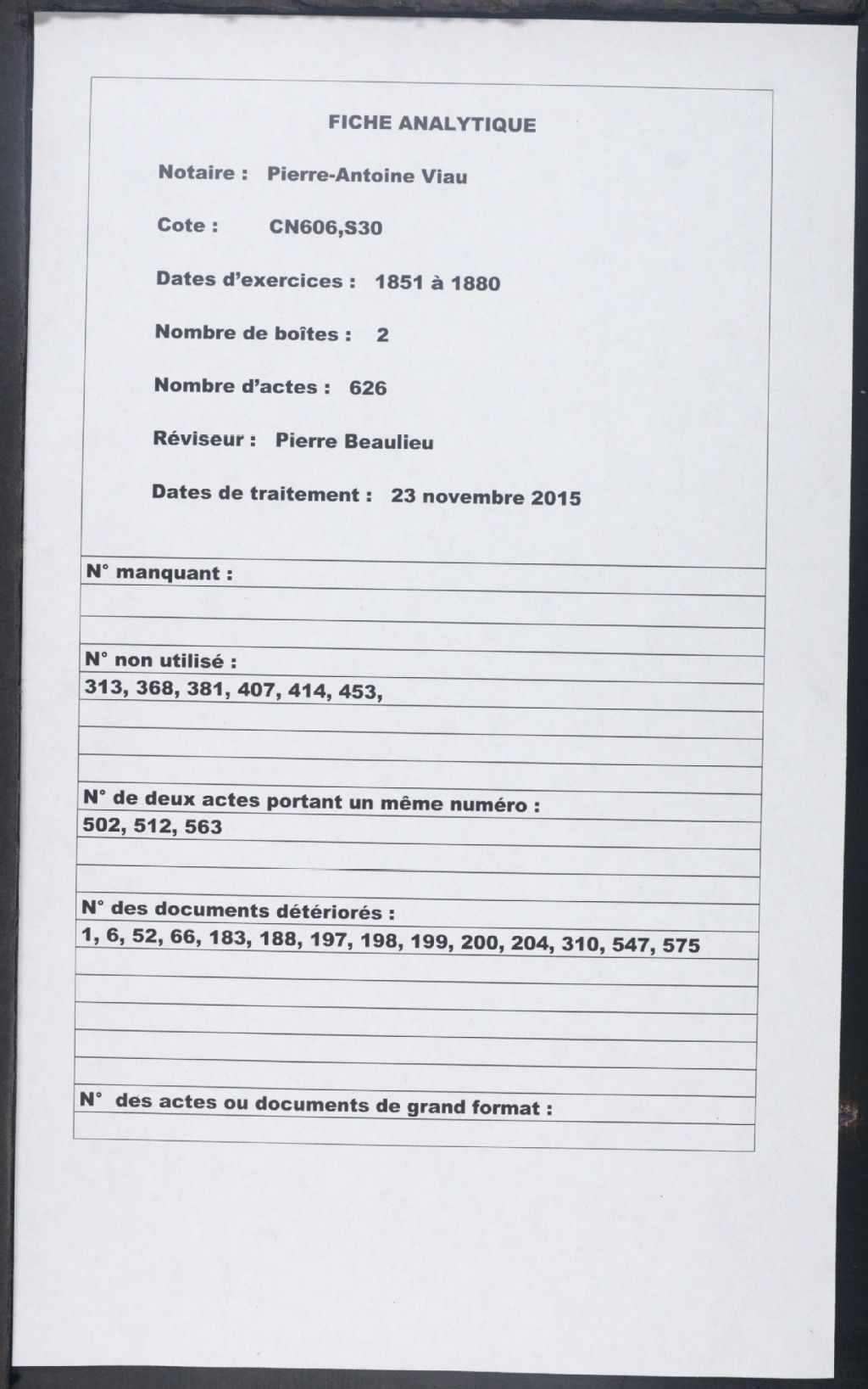Pierre-Antoine Viau, 1851-1880, Archives nationales à Montréal, Fonds Cour supérieure. District judiciaire de Terrebonne. Greffes de notaires, (06M,CN606,S30).