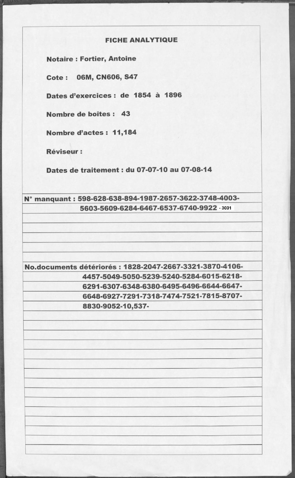 Antoine Fortier, 1854-1896, Archives nationales à Montréal, Fonds Cour supérieure. District judiciaire de Terrebonne. Greffes de notaires, (06M,CN606,S47).