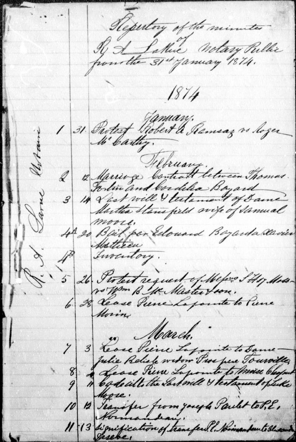 Adolphe-R. Larue, 1874-1876, Archives nationales à Montréal, Fonds Cour supérieure. District judiciaire de Montréal. Greffes de notaires, (06M,CN601,S240).