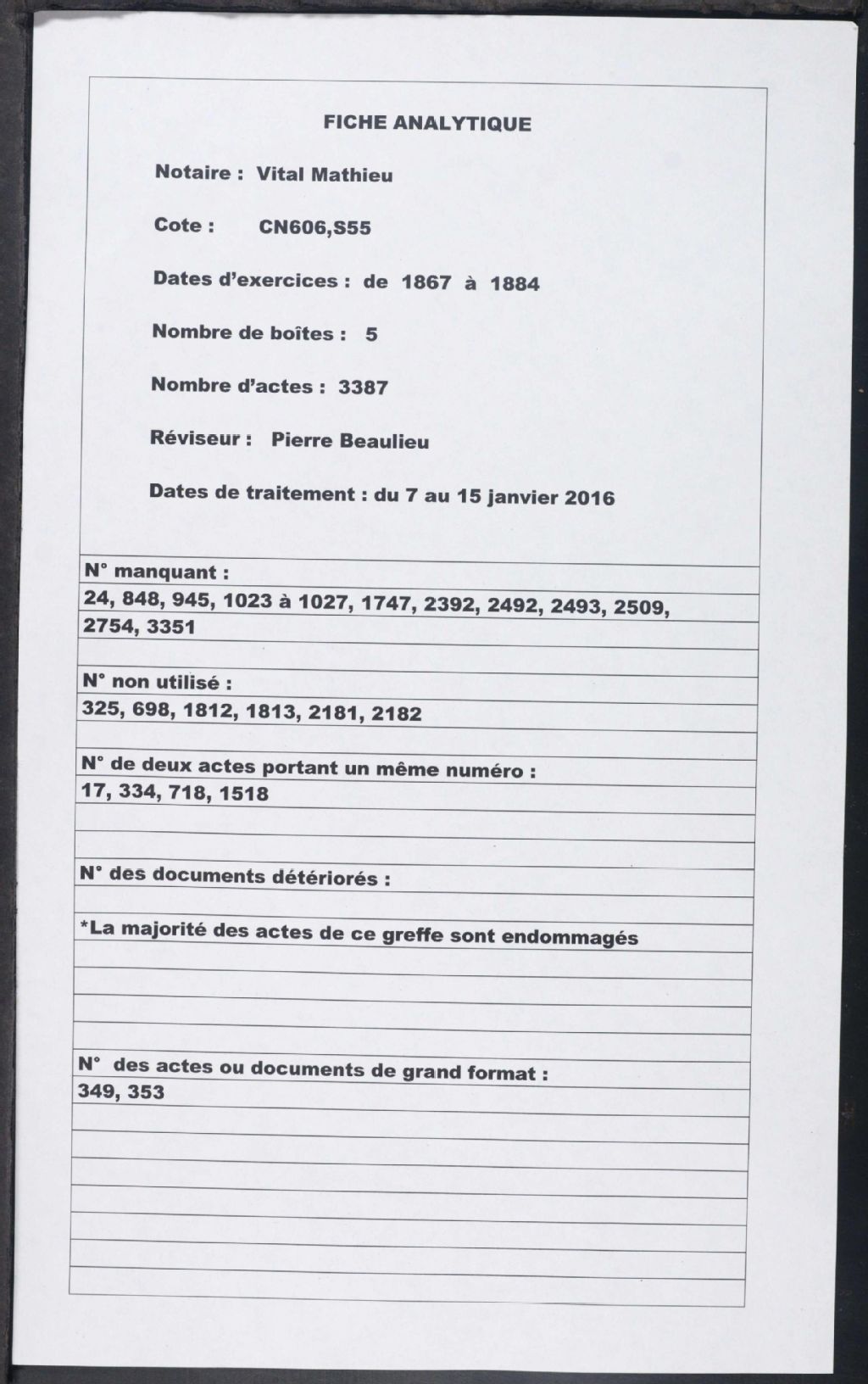 Vital Mathieu, 1867-1884, Archives nationales à Montréal, Fonds Cour supérieure. District judiciaire de Terrebonne. Greffes de notaires, (06M,CN606,S55).