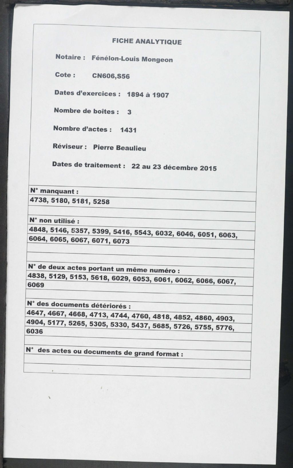 Fénélon-Louis Mongeon, 1894-1907, Archives nationales à Montréal, Fonds Cour supérieure. District judiciaire de Terrebonne. Greffes de notaires, (06M,CN606,S56).