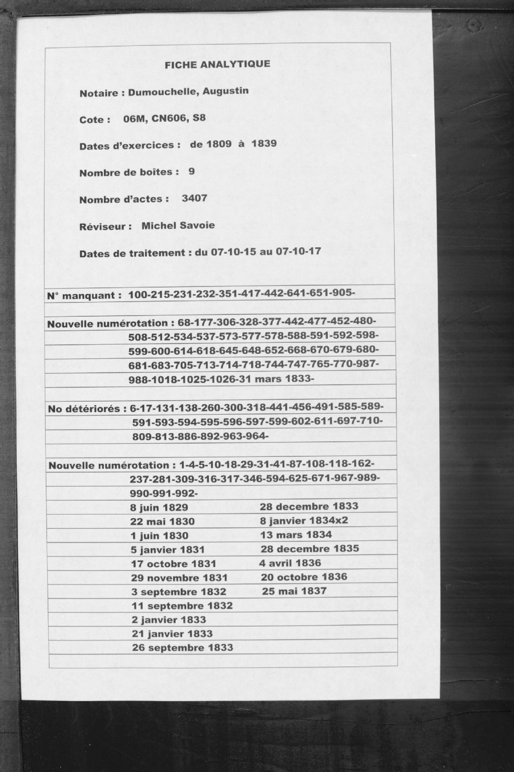 Augustin Dumouchelle, 1809-1839, Archives nationales à Montréal, Fonds Cour supérieure. District judiciaire de Terrebonne. Greffes de notaires, (06M,CN606,S8).