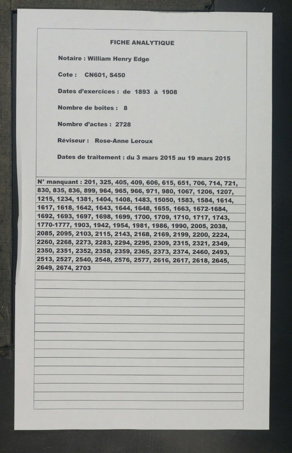 William Henry Edge, 1893-1908, Archives nationales à Montréal, Fonds Cour supérieure. District judiciaire de Montréal. Greffes de notaires, (06M,CN601,S450).