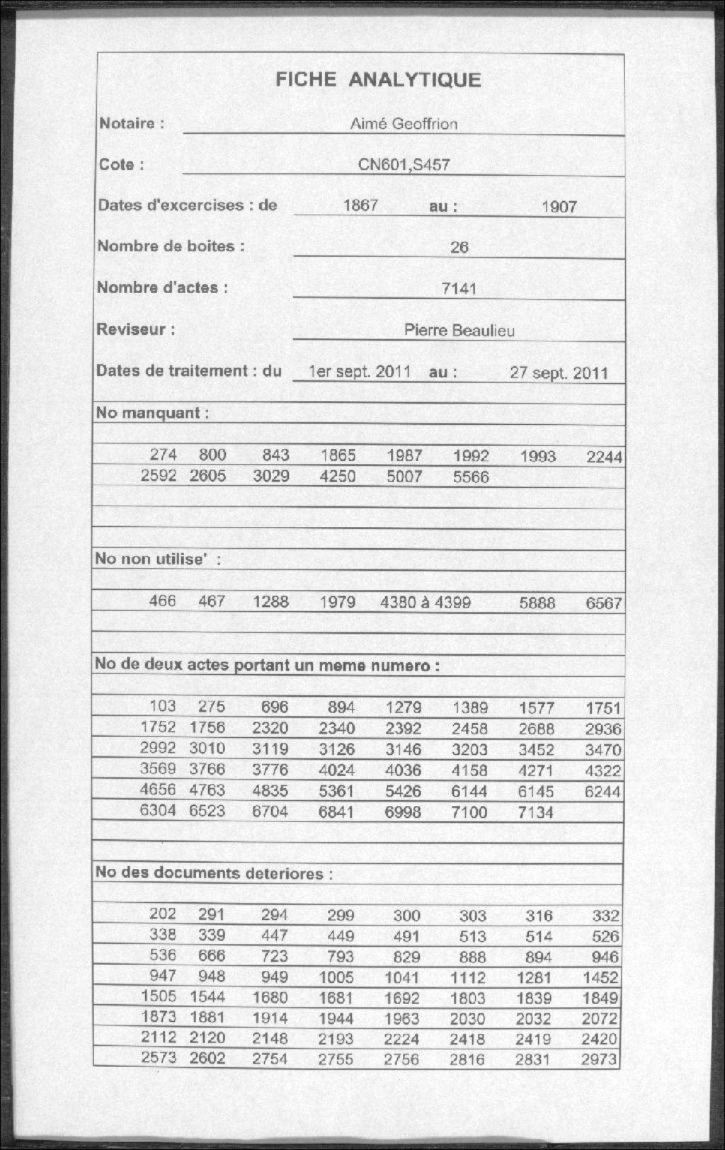 - Comprend des documents de grand format accompagnant les actes suivants :N¿ 6753 (17 mars 1902 - Vente par Napoléon Chicoine au Gouvernement de la Puissance du Canada) : Plan showing the land required by the Government of the Dominion of Canada for the erection of a light house on the property of Napoleon Chicoine, being the cadastral number twenty seven (27) of the parish of Vercheres, in the county of Vercheres, P.Q. / C. Leduc, P.L.S. (Dupont & Leduc), 5 décembre 1901 ¿ 33,5 x 37,5 cmN¿ 6754 (17 mars 1902 - Vente par François-Xavier Chicoine au Gouvernement de la Puissance du Canada) : Plan showing the land required by the Government of the Dominion of Canada for the erection of a light house on the property of François-Xavier Chicoine, being the cadastral number thirty one (31) of the parish of Vercheres, in the county of Vercheres, P.Q. / C. Leduc, P.L.S. (Dupont & Leduc), 5 décembre 1901 ¿ 26 x 63,5 cmN¿ 6755 (17 mars 1902 - Vente par Napoléon Senécal au Gouvernement de la Puissance du Canada) : Plan showing the land required by the Government of the Dominion of Canada for the erection of a light house on the property of Napoléon Senecal, being the cadastral number sixty two (62) of the parish of Vercheres, in the county of Vercheres, P.Q. / C. Leduc, P.L.S. (Dupont & Leduc), 6 décembre 1901 ¿ 33 x 80 cmN¿ 6756 (17 mars 1902 - Vente par Félix Bousquet au Gouvernement de la Puissance du Canada) : Plan showing the land required by the Government of the Dominion of Canada for the erection of a lighthouse on the property of Felix Bousquet, being the cadastral number one hundred and ninety eight (198) of the parish of Vercheres, in the county of Vercheres, P.Q. / C. Leduc, P.L.S. (Dupont & Leduc), 9 décembre 1901 ¿ 33 x 45 cmN¿ 6881 (13 janvier 1903 - Vente par William H. Kingston au Gouvernement de la Puissance du Canada) : Plan and description of certain lands taken for the use of His Majesty the King, and used as the Public Work, known as Ile Deslauriers Lighthouse [River St-Lawrence] / C. Leduc, P.L.S., 11 décembre 1900 ¿ 33,5 x 38,5 cmN¿ 7027 (11 novembre 1903 - Vente par Louis Roch au Gouvernement de la Puissance du Canada) : Plan of land required for the site of the front range light on Ile à l'Aigle P.Q., [20 avril 1903?] ¿ 34 x 47,5 cmN¿ 7028 (11 novembre 1903 - Vente par Joseph Jodoin au Gouvernement de la Puissance du Canada) : Plan of land required for the site of the back range light on Ile à l'Aigle P.Q., [25 avril 1903?] ¿ 27 x 47 cmN¿ 7029 (11 novembre 1903 - Vente par Elmina alias Amanda Painchaud, épouse de Philippe Lussier, au Gouvernement de la Puissance du Canada) : Plan of land required for the site of the back range light at Varennes Village P.Q., [27 avril 1903?] ¿ 29 x 29,5 cmN¿ 7082 (9 mai 1904 - Vente par Zéphirin Roy au Gouvernement de la Puissance du Canada) : Part of land required by the department of Marine and Fisheries for St. Ours Traverse back range lighthouse, [21 janvier 1904?] ¿ 37 x 47 cmN¿ 7083 (9 mai 1904 - Vente par Joseph & Ernest Guyon au Gouvernement de la Puissance du Canada) : Plan of land required by the Department of Marine and Fisheries for Contrecoeur to Verchères back range lighthouse, [18 janvier 1904?] ¿ 31 x 40,5 cm