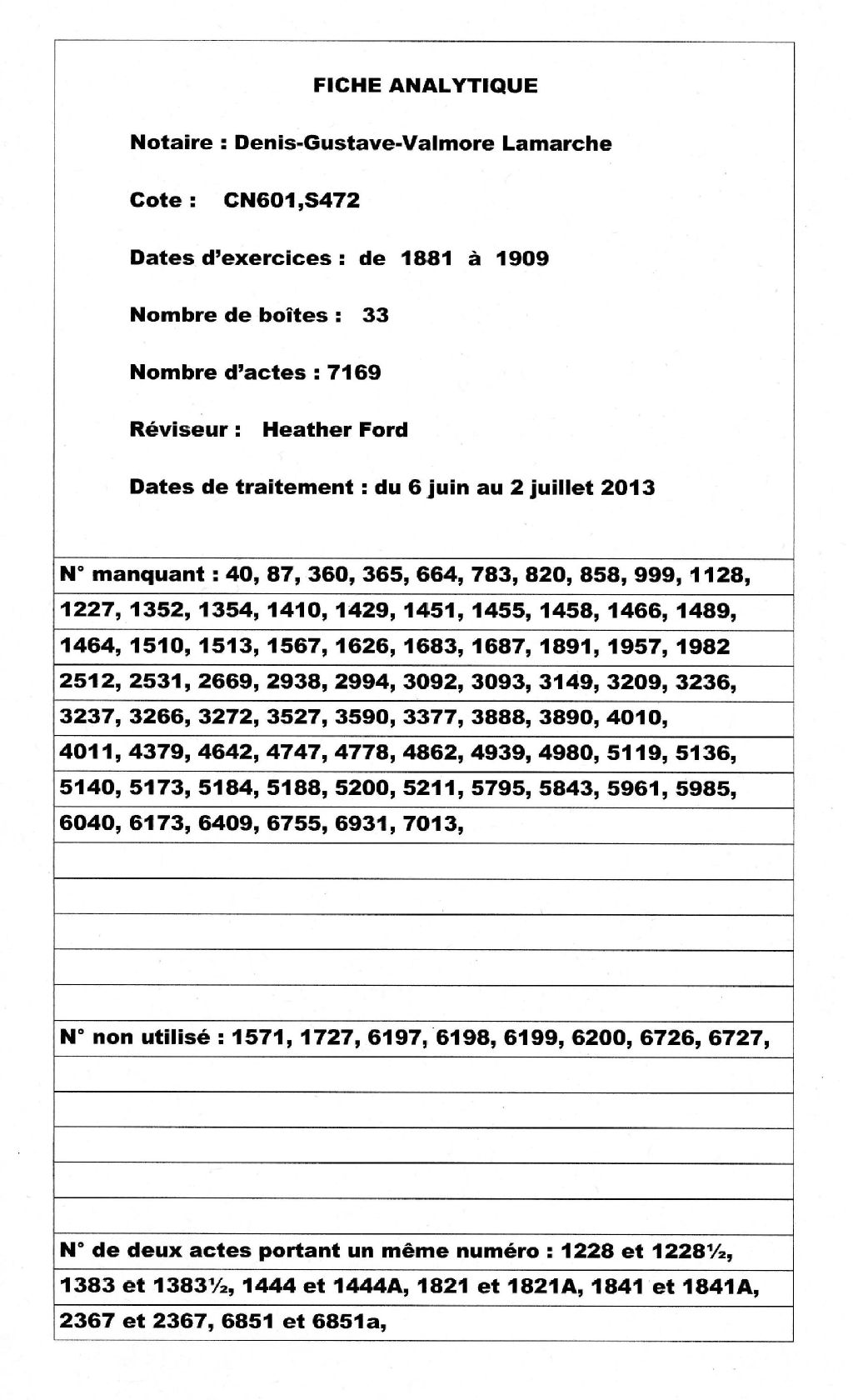 - Comprend des documents de grand format accompagnant les actes suivants :No 706 (26 juin 1886 - Vente par Dame Marguerite Harnois, veuve de Louis Sanders, & autres à Joseph Beauchamp) : Sans titre [Rue Ste-Catherine, Rue des Allemands] / L.R. Montbriant, architecte, 22 juin 1886 -- 1 plan -- 38 x 38 cmNo 1146 (29 mai 1888 - Conventions entre Les Religieuses Soeurs Hospitalières de Saint-Joseph de l'Hôtel-Dieu de Montréal, La succession de feue Dame Agathe Perrault, veuve Maurice Nowlan, et La Corporation du Village de la Cote St-Louis du Mile End) : Plan figuratif pour annexer au contrat de donation par les Soeurs de l'Hôtel-Dieu, et la succession Nowlan à la Corporation du Village du Mile End dans le comté d'Hochelaga / H.M. Perrault, 19 mai 1888 -- 46,5 x 33 cmNo 1960 (30 juin 1891 - Vente par Henry Jégou Du Laz à Jean Baptiste Napoléon Chabot) : Plan d'une partie du lot no 870, Quartier St-Jacques, Cité de Montréal [Rue St-André, Rue Ontario, Rue St-Cristophe (sic) / J. Emile Vanier, 23 juin 1891 -- 21 x 57,5 cmNo 2366 (27 janvier 1893 - Right of way by Les Religieuses Soeurs Hospitalières de Saint-Joseph de l'Hôtel-Dieu de Montréal to Richard Wilson Smith) : Plan showing the subdivision of lot 99, St. Lawrence Ward, City of Montreal [Sherbrooke Street, Milton Street] / J.P.B. Casgrain, 16 mars 1892 -- 53,5 x 86 cmNo 2666 (16 décembre 1893 - Sale & agreement between Les Religieuses Soeurs Hospitalières de Saint-Joseph de l'Hôtel-Dieu de Montréal & Robert MacKay) : Plan d'une propriété appartenant aux Dames de L'Hotel Dieu située dans la Ville de St-Henri indiquant sa subdivision en lots [Rue Bethune] / Ernest Bélanger, 31 octobre 1893 -- 48 x 33 cmNo 2773 (9 mai 1894 - Vente de mitoyenneté de mur par la Succession Patrick Grace au Dr. Phillippe Edmond Mount) : Mur mitoyen entre les bâtisses appartenant à P.E. Mount M.D. et la Succession Pat. Grace -- 1 plan -- 33 x 35,5 cmNo 2978 (14 février 1895 - Vente par Wilfrid Clavel à Raymond Préfontaine & Frédéric R. Alley) : Plan indiquant les lots nos 19B, 20B, 21B, 22B du cadastre de la paroisse de Ste Agathe des Monts étant parties des lots originaires 19, 20, 21, 22 du 3me rang du Township de Bereford, Comté de Terrebonne, exrait du plan officiel [Lac des Sables] / J.P.B. Casgrain, 5 février 1895 -- 26 x 31 cmNo 3376 (11 septembre 1896 - Deed of sale by the Estate George Ross & al to Jean Baptiste Péloquin) : Plan showing lot no 240-136 & part of 240-135, Parish of Sault au Recollet ; The property of the late George Ross, M.D. / J.P.B. Casgrain, 10 août 1896 -- 2 plans -- 39,5 x 41 cm ; 33 x 51,5 cmNo 3382 (18 septembre 1896 - Lease by David Ouimet to John Downey) : Propriété de D. Ouimet, rue St Urbain [indique l'emplacement d'une manufacture de savon] -- 1 plan -- 43 x 21 cmNo 3412 (23 octobre 1896 - Deed of sale by Raymond Préfontaine & Frédéric R. Alley to Donald MacMaster) : Plan of lots nos 19B-8, 19B-9, 19B-10, 19B-11 and part of 19B (unsubdivided), Third Range, Township of Beresford, Parish of St. Agathe, County of Terrebonne [Lac des Sables] / J.P.B. Casgrain, 21 octobre 1896 -- 44,5 x 30 cmNo 3416 (2 novembre 1896 - Deed of sale from the Estate George Ross & al to Bleury St-Aubin) : Plan showing part of lot no 240-135, Parish of Sault au Recollet / J.P.B. Casgrain, 10 août 1896 -- 39 x 38 cmNo 3853 (8 juin 1898 - Conventions entre la Succession Joseph Aimé Massue & Marie Hortense Lia Carrière, épouse séparée de Joseph Girard) : Plan indiquant certains terrains appartenant à Hortense Lia Carrière, épouse de Jos. Girard, situés dans le Quartier St-Denis, Cité de Montréal [Rue des Érables, Rue Montana, Rue Perrault] / J.H. Leclair, 28 mai 1898 -- 30 x 26,5 cmNo 4570 (10 juillet 1900 - Release by Hon. George Washington Stephens unto Her Majesty The Queen, represented by Hon. Andrew G. Blair, Minister of Railway & Canals of Canada) : Plan shweing portion of River St. Pierre before deepening in July 11898 and new water line since deepening / Ernest Marceau -- 31 x 111 cmNo 4770 (29 mars 1901 - Quittance & compromis entre Damase Legault & Les Religieuses Soeurs Hospitalières de Saint-Joseph de l'Hôtel-Dieu de Montréal) : Plan montrant en rouge cette partie du lot no 195 de la Paroisse de Ste Anne du Bout de l'Isle prise par la Compagnie de Chemin de Fer Pacifique Canadien / J.L. Michaud, avril 1900 -- 38 x 45 cmNo 4833 (30 mai 1901 - Partage entre Joseph Johnston & Thomas O'Connell) : Plan of lot no 1337, St. Ann's Ward, Montreal [Murray Street, Ottawa Street] / W. McLea Walbank, 16 mai 1901 -- 28 x 35 cmNo 5204 (24 juillet 1902 - Sale by Isaïe Préfontaine to The Shawinigan Water and Power Company) : Plan showing part of lot no 18, Incorporated Village of Hochelaga now Town of Maisonneuve [Earnest Street, Orleans Street (projected), Chateauguay & Northern Railway] / J.P.B. Casgrain, 11 juillet 1902 -- 47 x 71 cmNo 5216 (6 août 1902 - Conventions entre Thomas Gauthier & Adjuteur Carmel & quittance par Arthur Thomas à Thomas Gauthier) : Plan d'une partie du lot no 35, Paroisse de Boucherville, Comté Chambly / J.P.B. Casgrain, 30 juin 1902 -- 48 x 56 cmNo 5693 (11 mars 1904 - Vente par Dame Ellen Irène Childs, épouse séparée de James A. Bazin, à L'Hon. Trefflé Berthiaume) : Plan d'une partie du lot no 105, Quartier St-Laurent [Rue Prince Arthur, Rue St-Urbain, Rue Elgin] / J.P.B. Casgrain, 27 février 1904 -- 68 x 55 cmNo 5769 (31 mai 1904 - Vente par Eliza Ann Snaith & al à Les Frères des Écoles Chrétiennes) : Plan of property belonging to the Estate of the late William Snaith situate in the Incorporated Village of la Cote de la Visitation, Parish of Montreal / Jos. Rielle, 25 avril 1904 -- 60 x 27 cmNo 6400 (24 juillet 1906 - Conventions & cession entre J. Auguste Richard, Alphonse Turcotte & Louis de Lotbinière Harwood) : Plan des nos 1776, 1777 et de la subdivision d'une partie du numéro 1775 de la Paroisse de Vaudreuil, P.Q. [Lac des Deux Montagnes] / A. Vinc