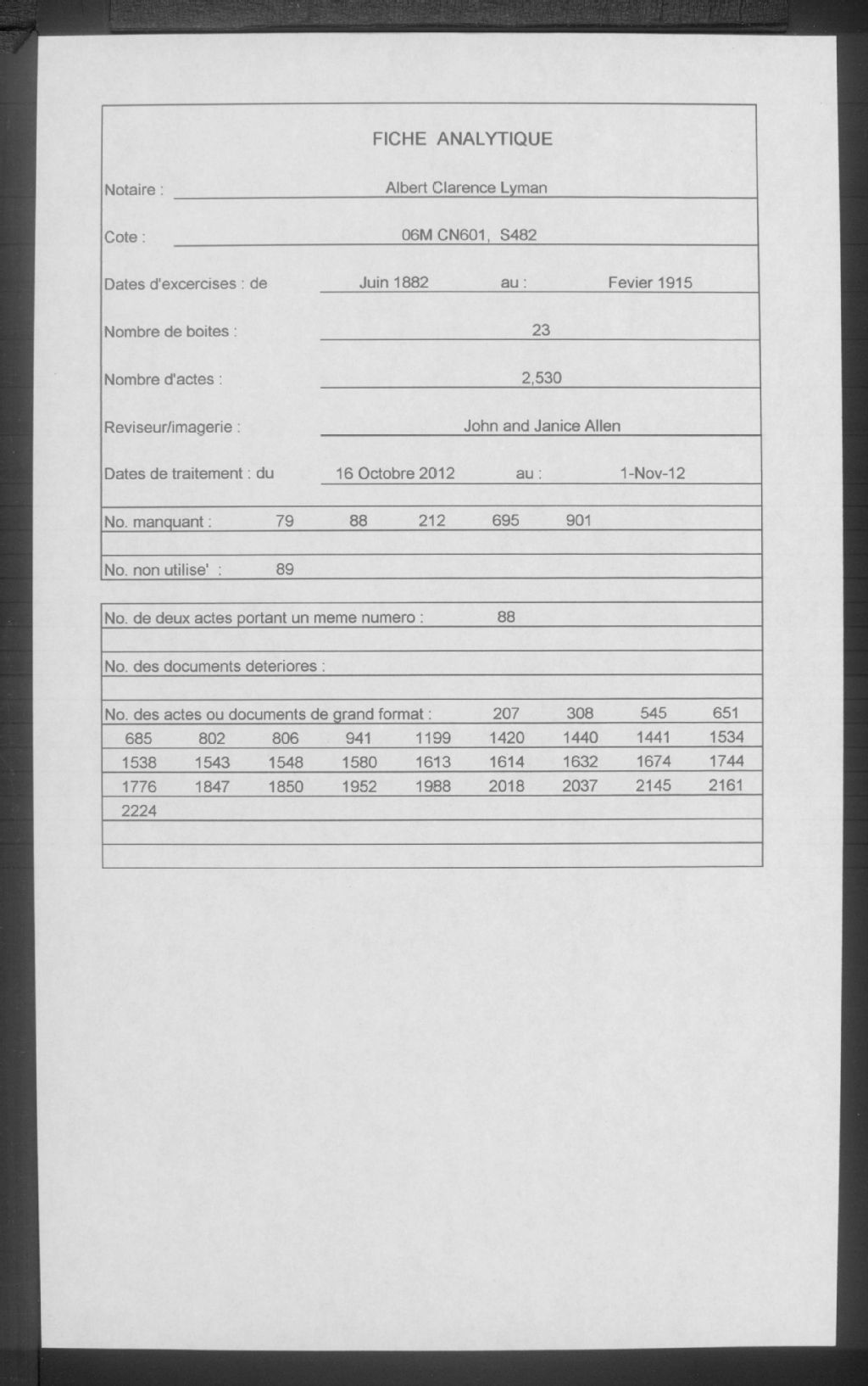 Albert Clarence Lyman, 1882-1915, Archives nationales à Montréal, Fonds Cour supérieure. District judiciaire de Montréal. Greffes de notaires, (06M,CN601,S482).
