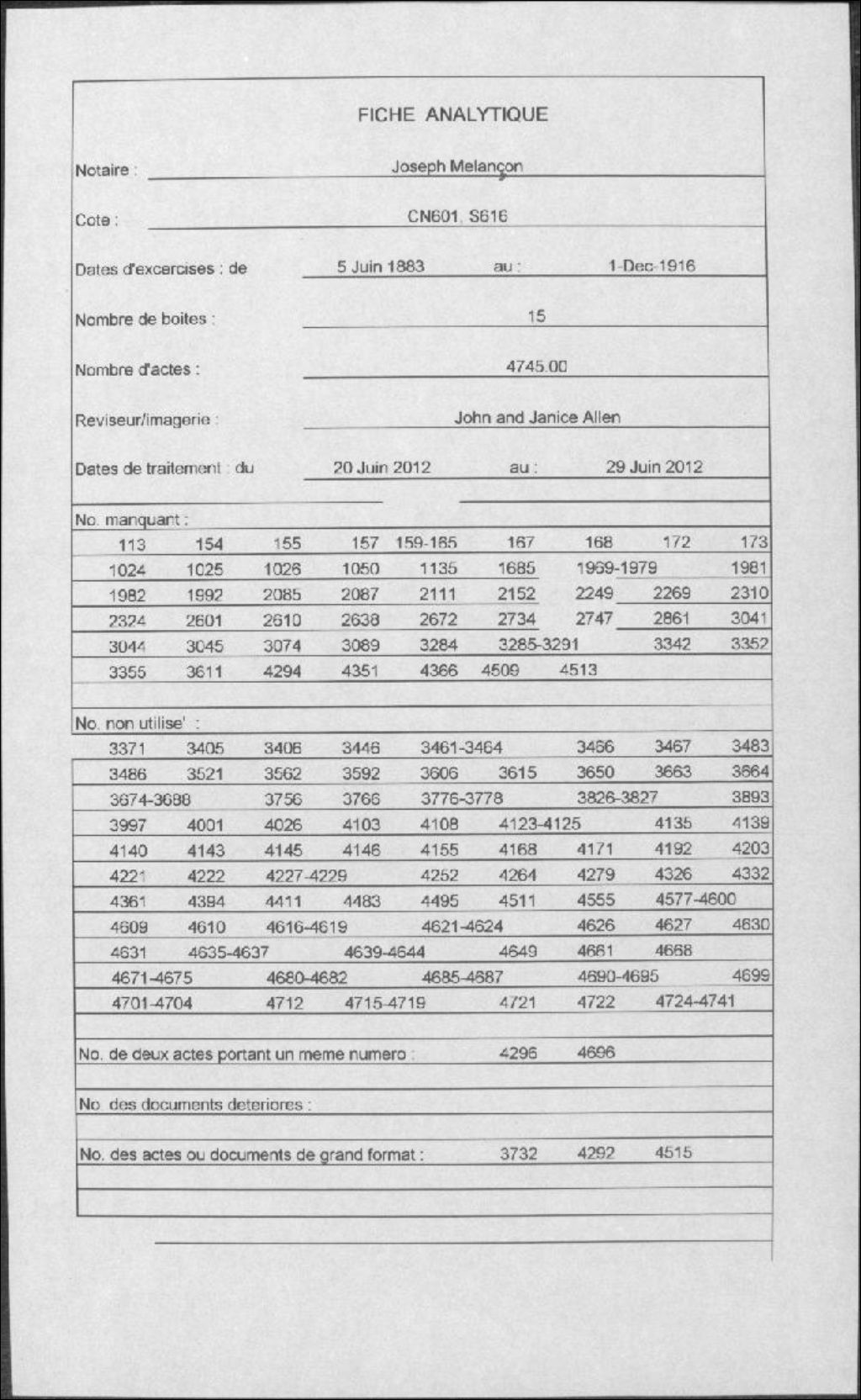 Joseph Melançon, 1883-1916, Archives nationales à Montréal, Fonds Cour supérieure. District judiciaire de Montréal. Greffes de notaires, (06M,CN601,S616).