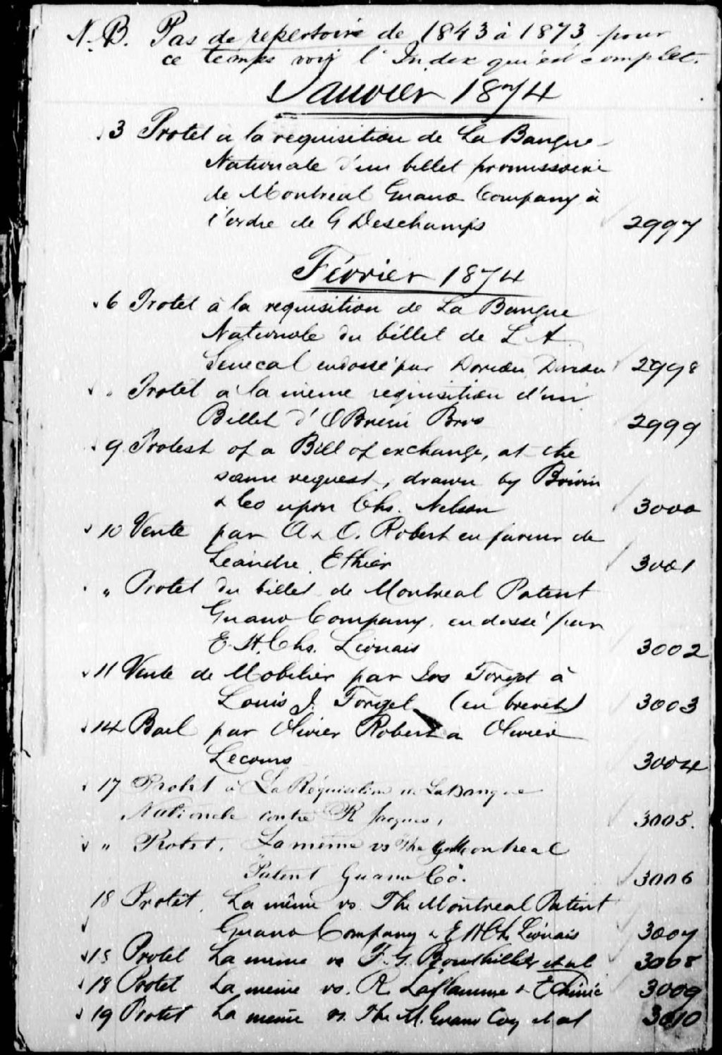 Jacques-Olivier Bureau, 1843-1883, Archives nationales à Montréal, Fonds Cour supérieure. District judiciaire de Montréal. Greffes de notaires, (06M,CN601,S65).