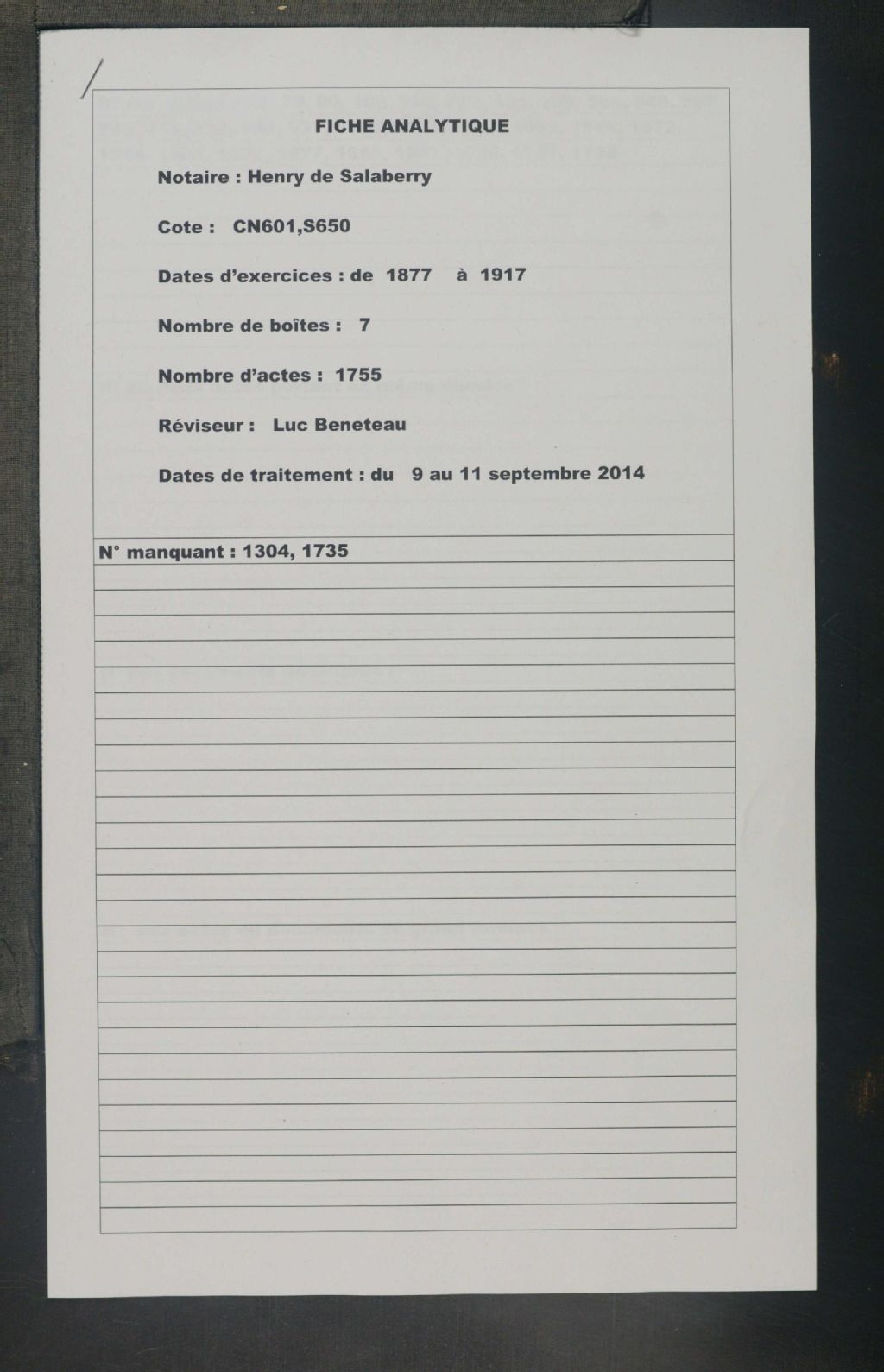 Henry de Salaberry, 1877-1917, Archives nationales à Montréal, Fonds Cour supérieure. District judiciaire de Montréal. Greffes de notaires, (06M,CN601,S650).