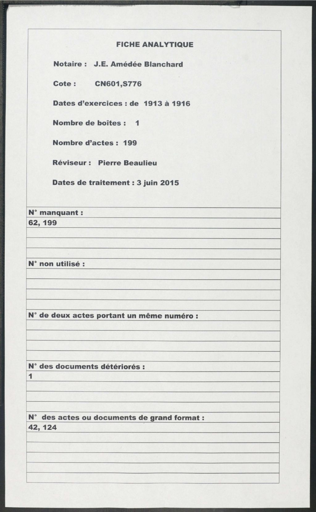 J.E. Amédée Blanchard, 1913-1916, Archives nationales à Montréal, Fonds Cour supérieure. District judiciaire de Montréal. Greffes de notaires, (06M,CN601,S776).