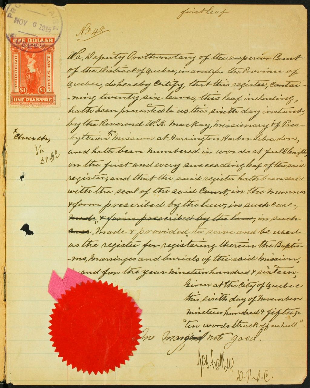Mission de Harrington Harbour, 1914-1920, Archives nationales à Sept-Îles, Fonds Cour supérieure. District judiciaire de Mingan. Etat civil, (09N,CE901,S20).