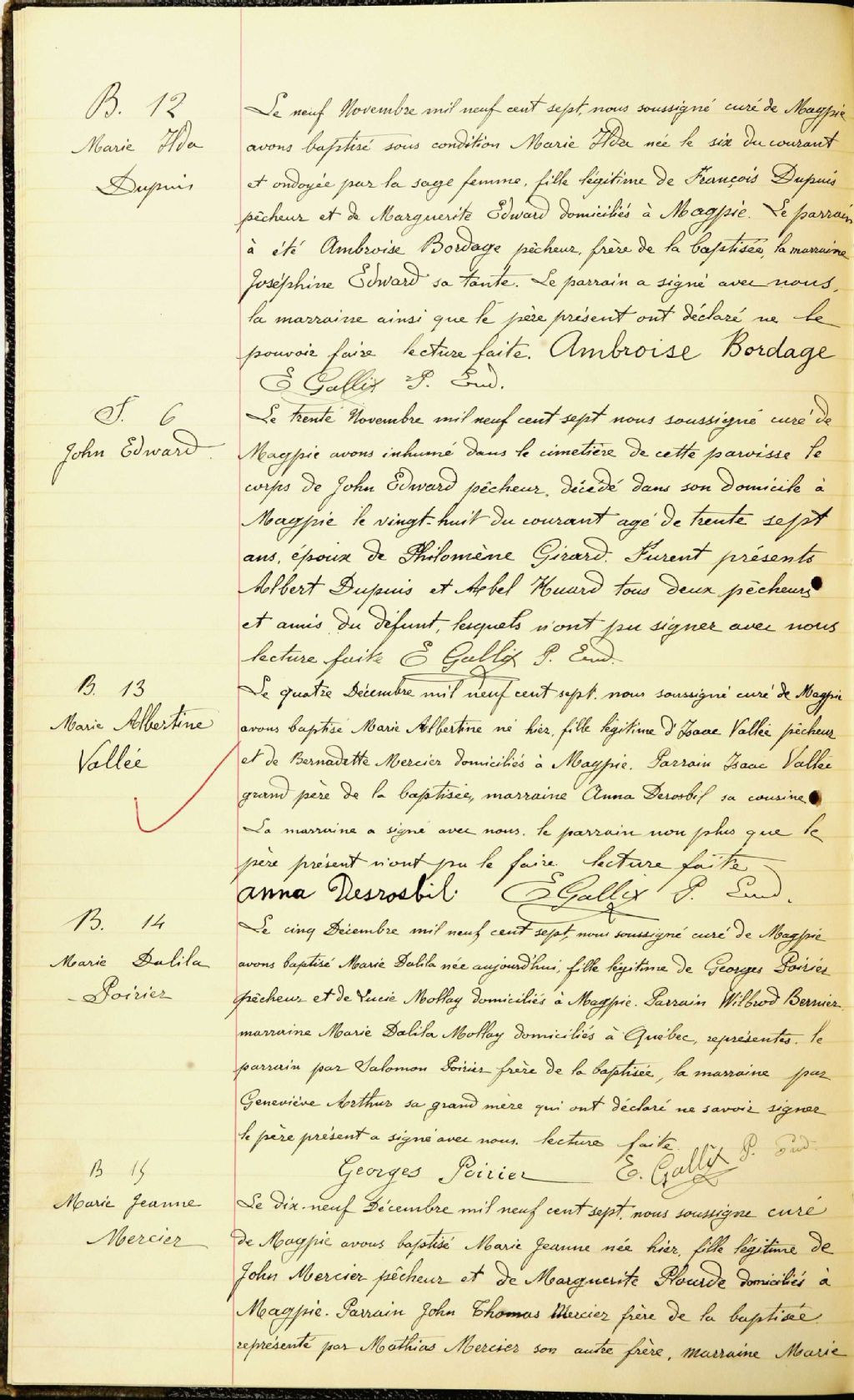 Saint-Jean-Apôtre de Rivière-Saint-Jean et Saint-Octave de Magpie, 1882-1922, Archives nationales à Sept-Îles, Fonds Cour supérieure. District judiciaire de Mingan. Etat civil, (09N,CE901,S4).