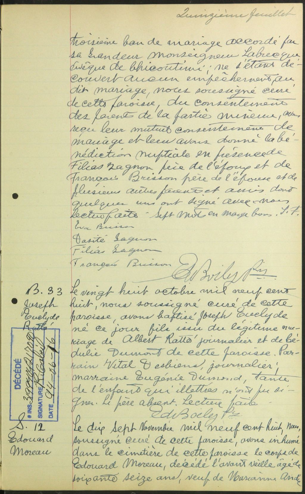 Saint-Marcellin des Escoumins, 1849-1922, Archives nationales à Sept-Îles, Fonds Cour supérieure. District judiciaire de Baie-Comeau. État civil, (09N,CE902,S1).