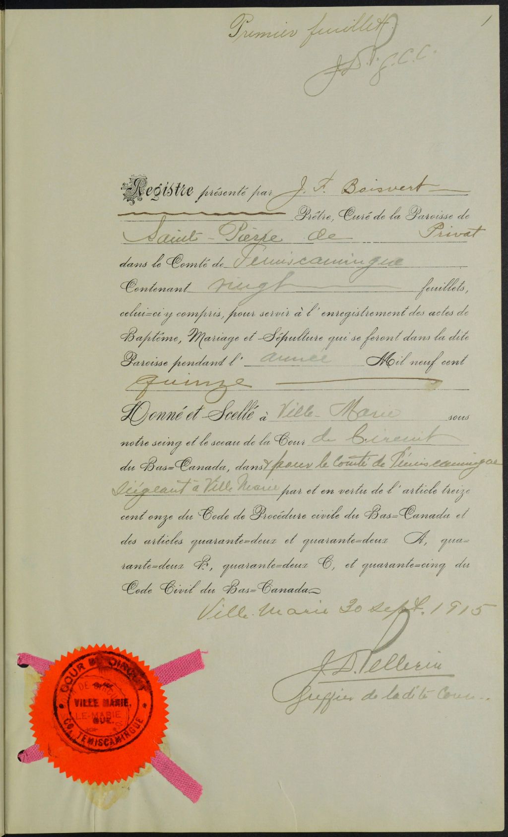 Saint-Pierre de Taschereau, 1915-1917, Archives nationales à Rouyn-Noranda, Fonds Cour supérieure. District judiciaire de l'Abitibi. État civil, (08Y,CE801,S5).