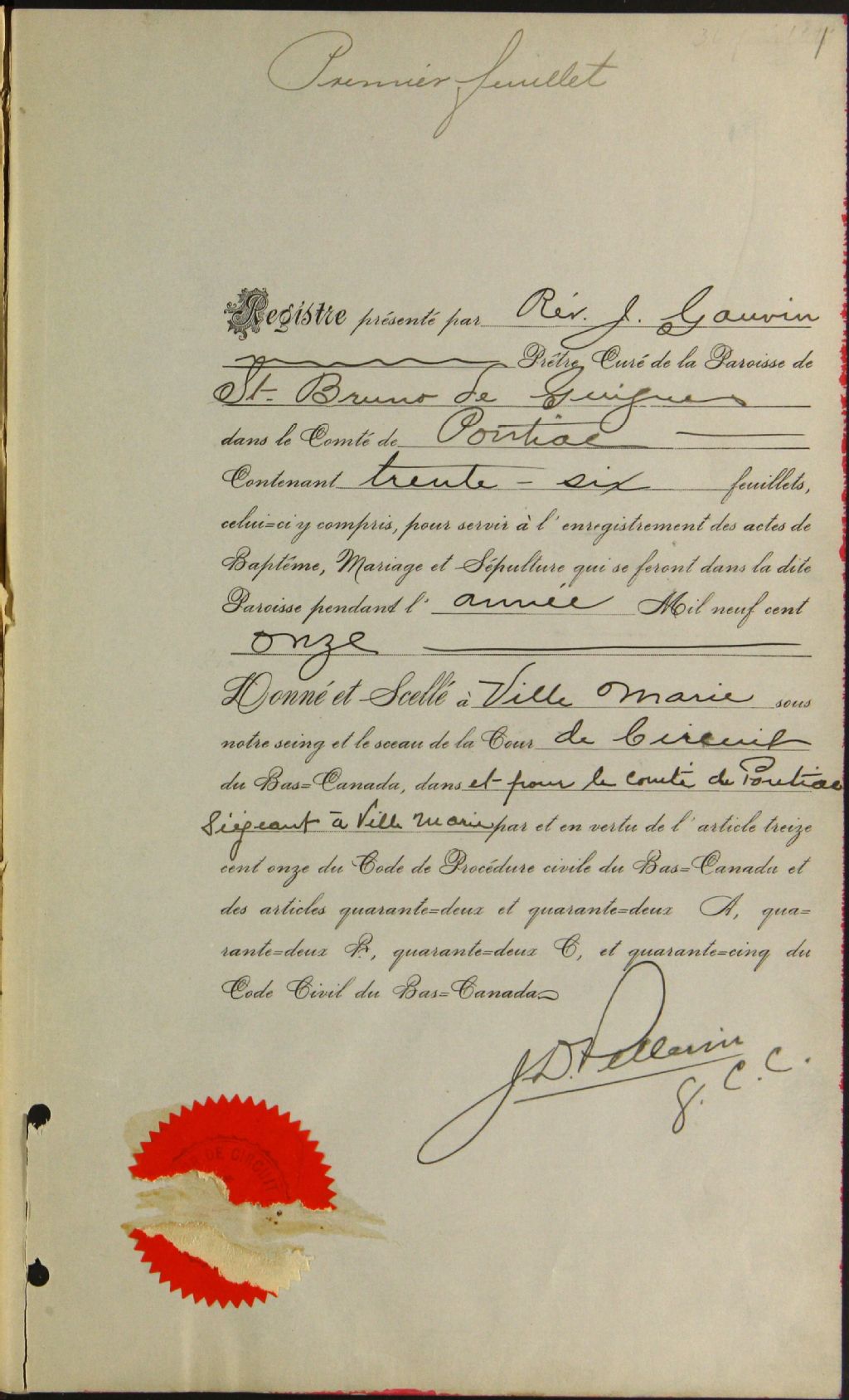 Cette série regroupe les registres originaux de l'état civil, lesquels contiennent les enregistrements de baptêmes, mariages et sépultures de la paroisse de Saint-Bruno-de-Guigues