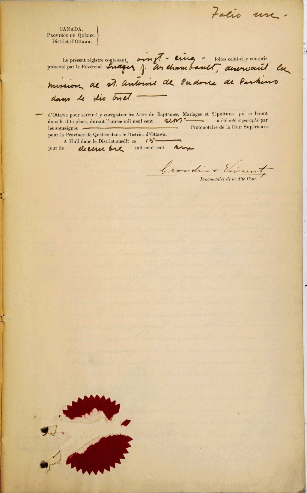 Saint-Antoine-de-Padoue, 1900-1902, 1905-1921, Archives nationales à Gatineau, Fonds Cour supérieure. District judiciaire de Hull. État civil, (07H,CE701,S11).