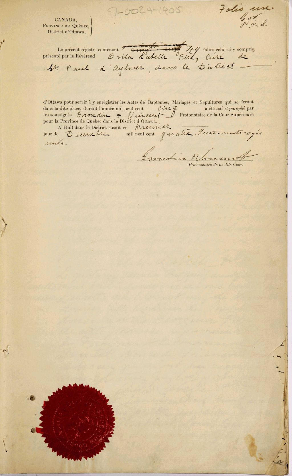 Saint-Paul-d'Aylmer, 1900-1921, Archives nationales à Gatineau, Fonds Cour supérieure. District judiciaire de Hull. État civil, (07H,CE701,S12).