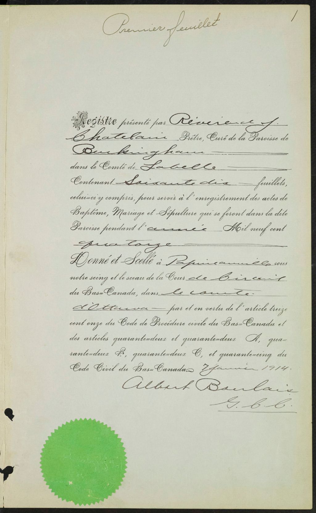 Saint-Grégoire-de-Nazianze-de-Buckingham, 1900-1921, Archives nationales à Gatineau, Fonds Cour supérieure. District judiciaire de Hull. État civil, (07H,CE701,S14).