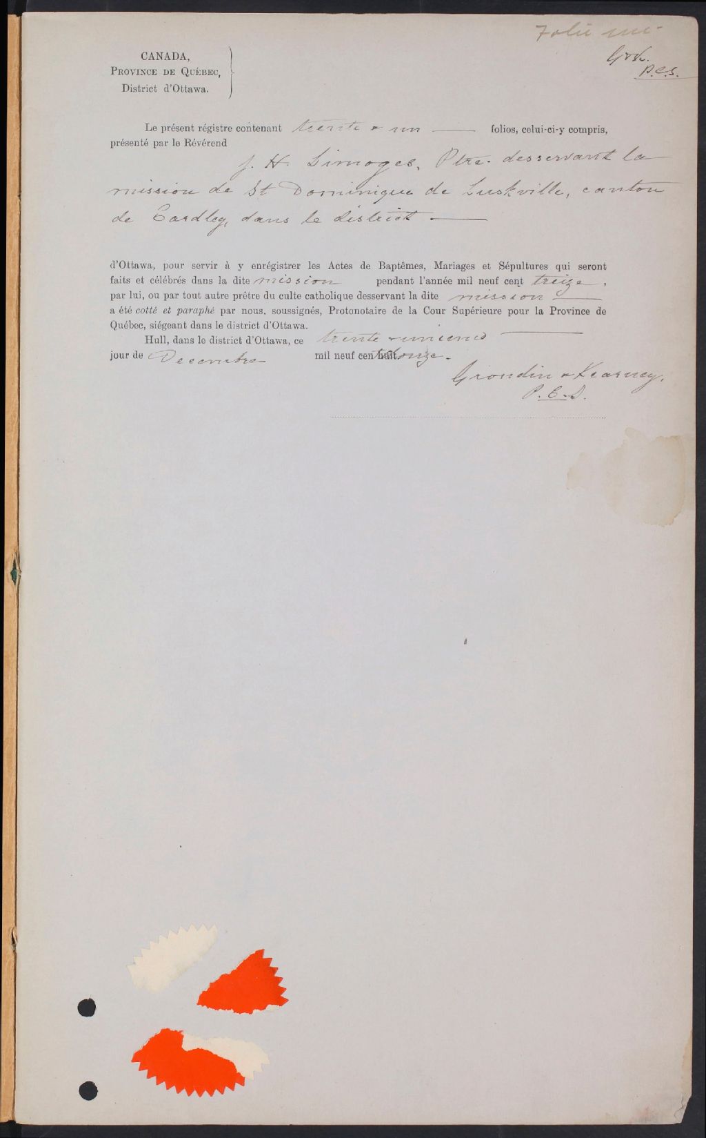 Saint-Dominique-de-Eardley, 1900-1921, Archives nationales à Gatineau, Fonds Cour supérieure. District judiciaire de Hull. État civil, (07H,CE701,S23).