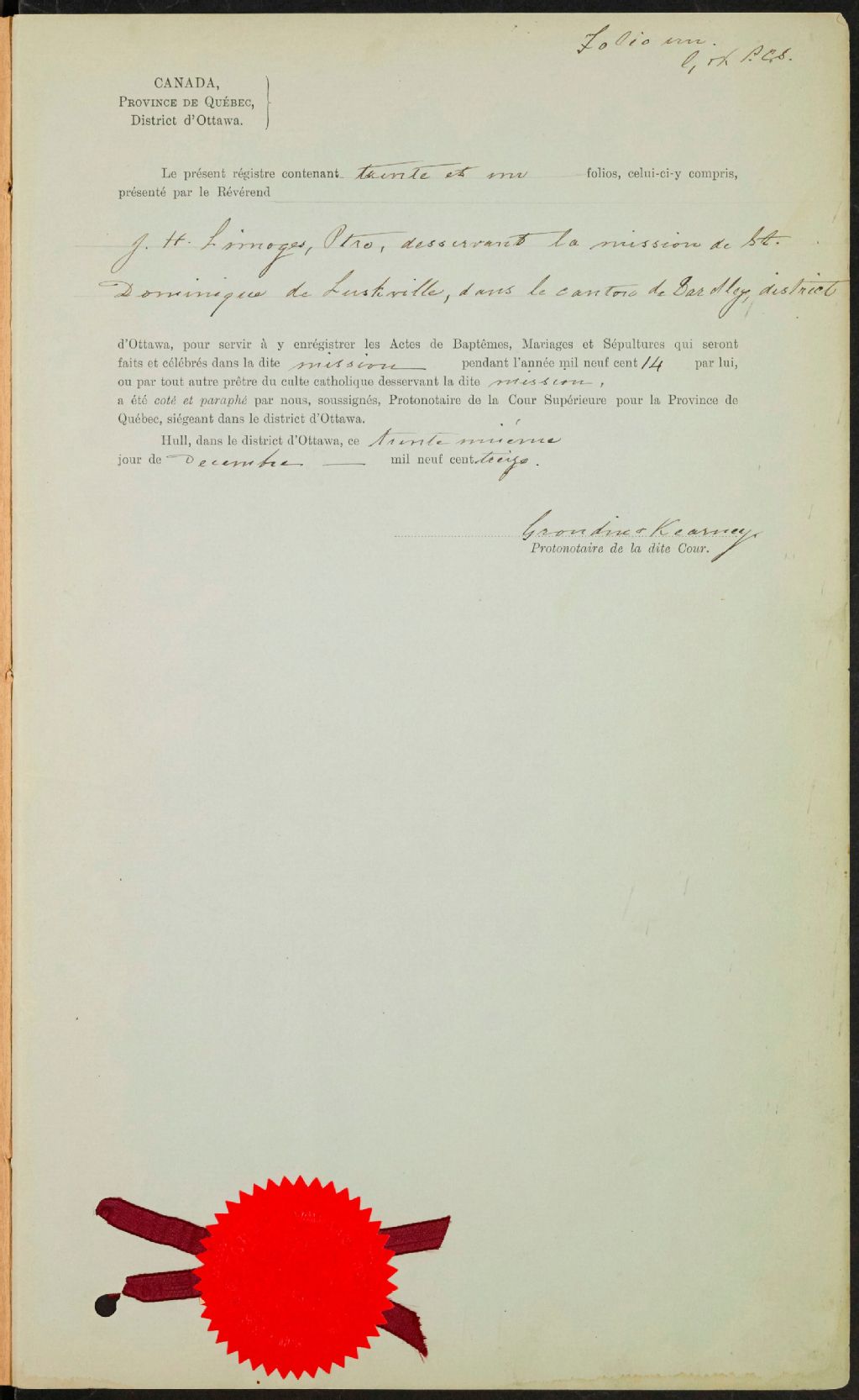 Saint-Dominique-de-Eardley, 1900-1921, Archives nationales à Gatineau, Fonds Cour supérieure. District judiciaire de Hull. État civil, (07H,CE701,S23).