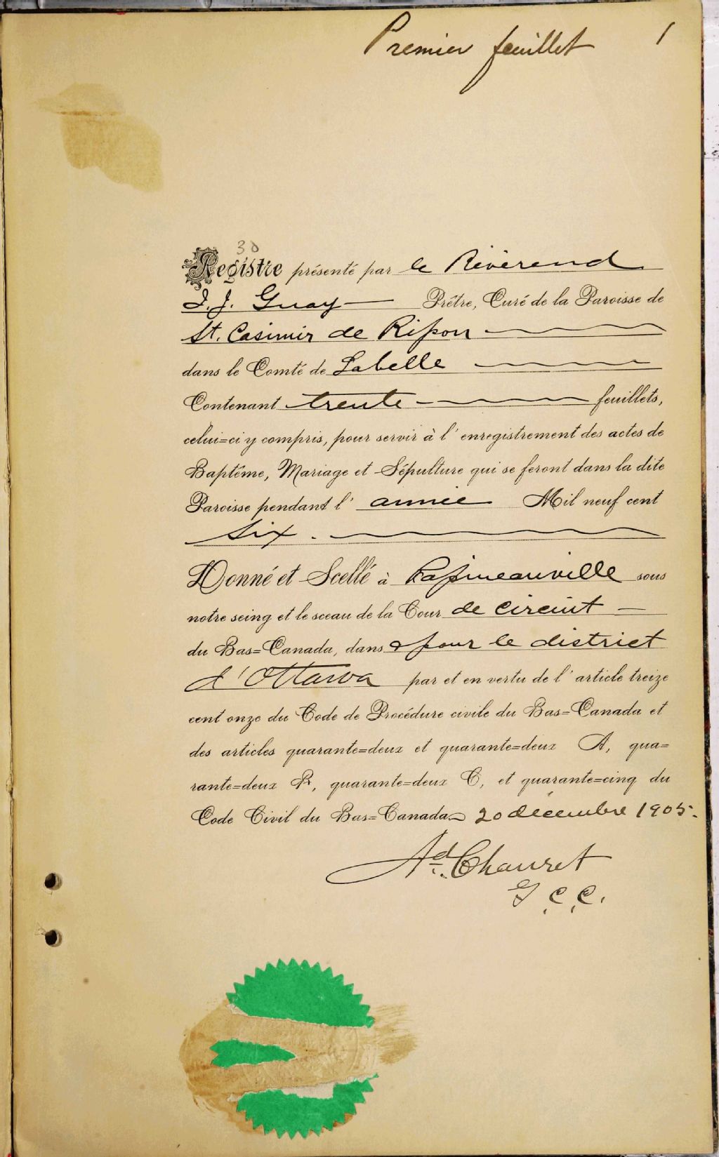 Saint-Casimir-de-Ripon, 1899-1921, Archives nationales à Gatineau, Fonds Cour supérieure. District judiciaire de Hull. État civil, (07H,CE701,S3).
