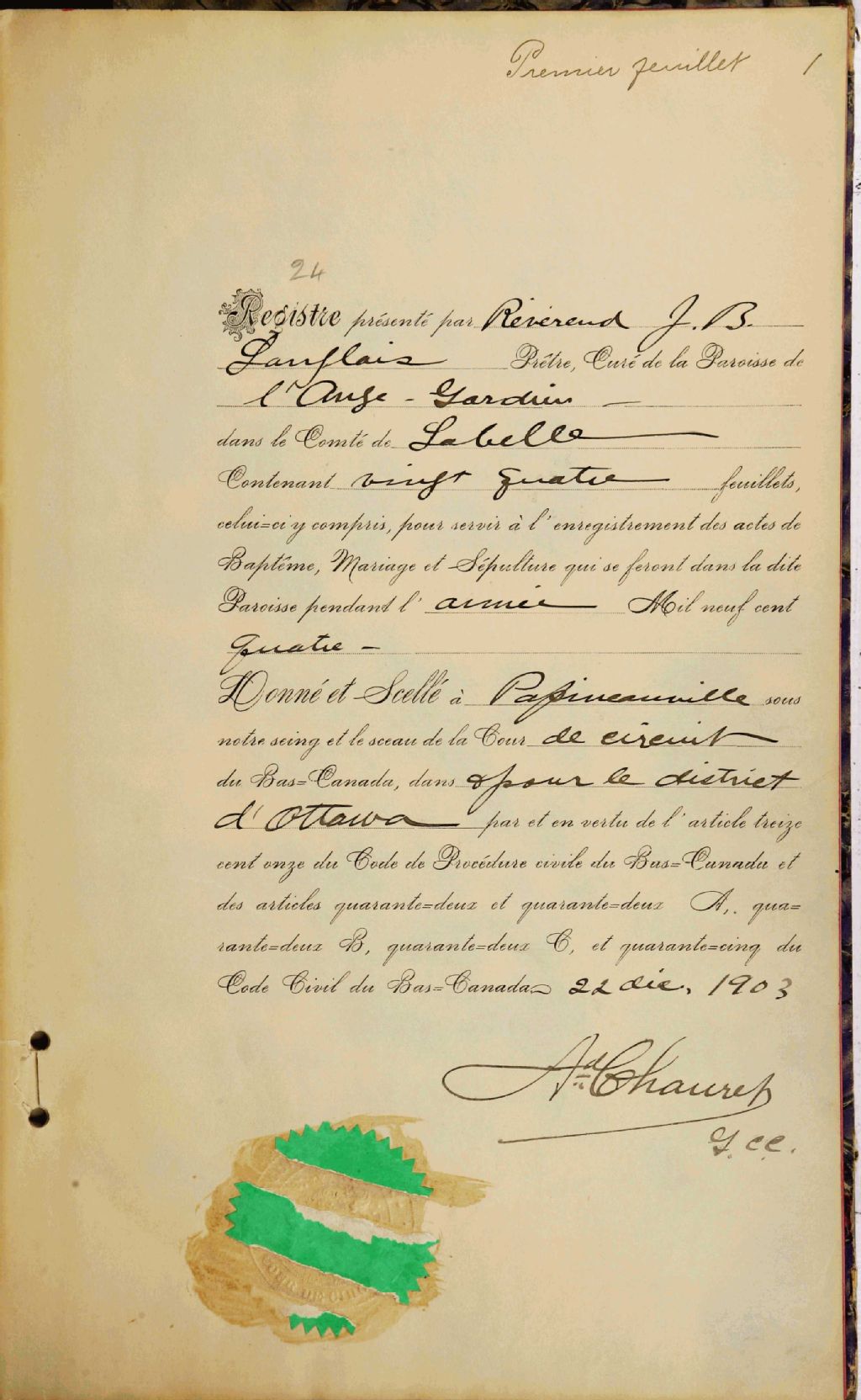 L'Ange-Gardien, 1899-1921, Archives nationales à Gatineau, Fonds Cour supérieure. District judiciaire de Hull. État civil, (07H,CE701,S4).