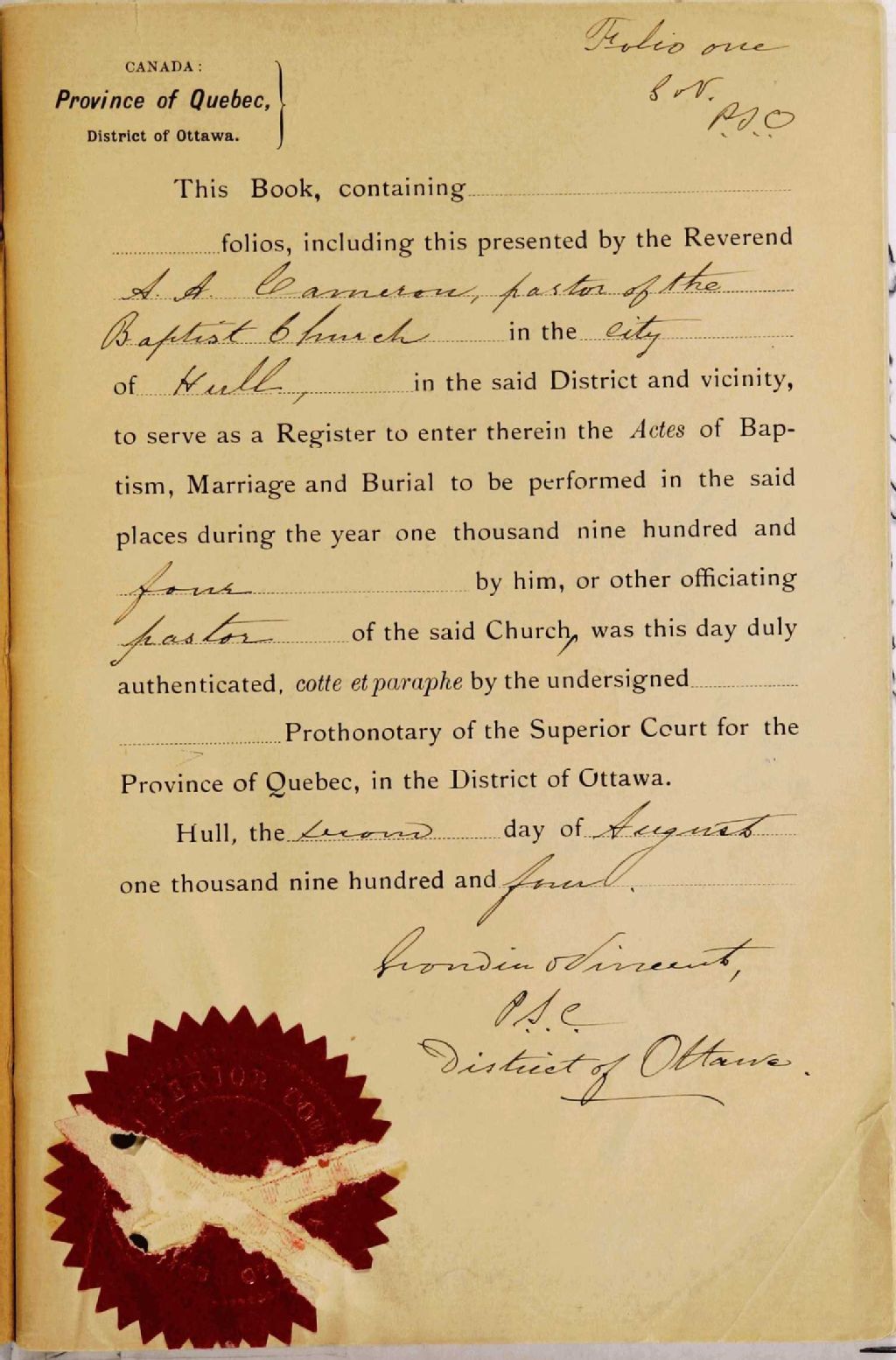 Hull Baptist Church, 1904, 1909-1911, 1913-1914, 1916-1921, Archives nationales à Gatineau, Fonds Cour supérieure. District judiciaire de Hull. État civil, (07H,CE701,S41).