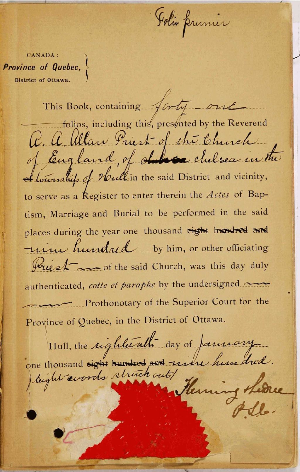 Chelsea Church of England, 1900-1913, 1920, Archives nationales à Gatineau, Fonds Cour supérieure. District judiciaire de Hull. État civil, (07H,CE701,S42).