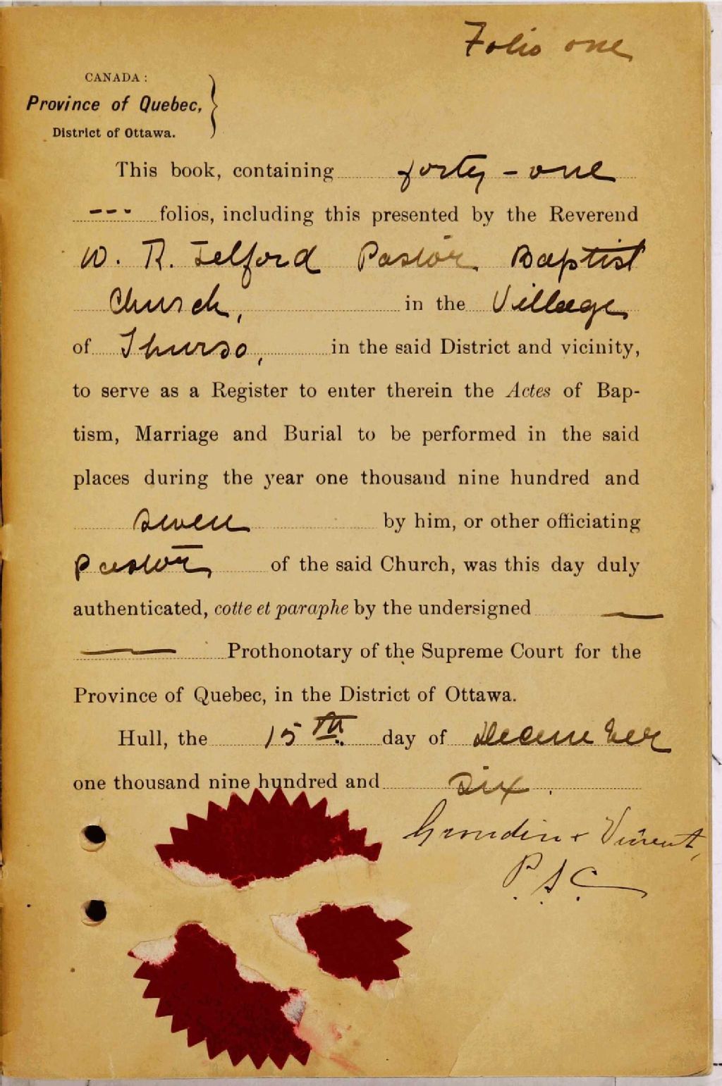 Thurso Baptist Church, 1900-1921, Archives nationales à Gatineau, Fonds Cour supérieure. District judiciaire de Hull. État civil, (07H,CE701,S52).