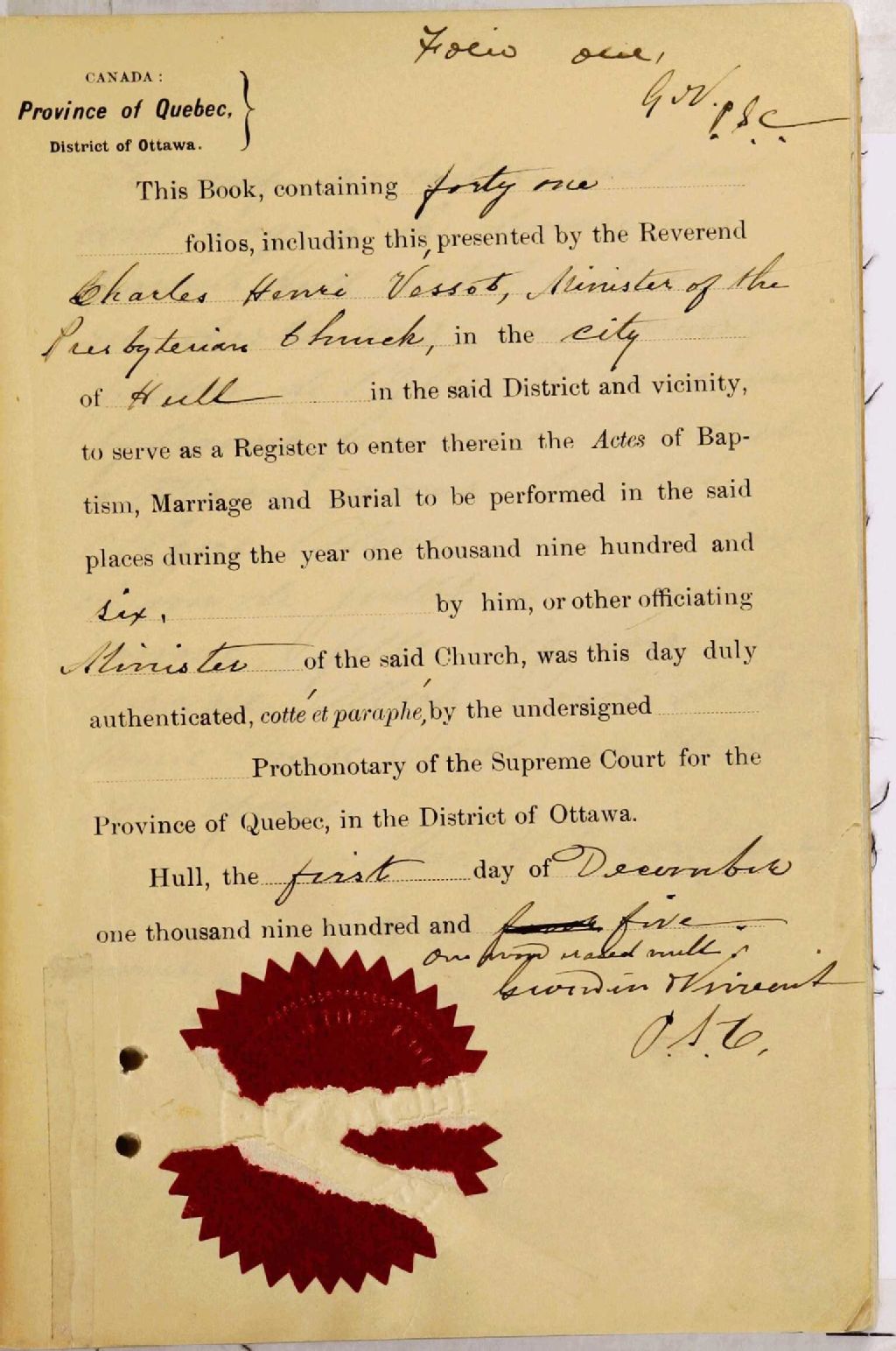 Église presbytérienne française Saint-Marc, 1906-1908, 1910-1920, Archives nationales à Gatineau, Fonds Cour supérieure. District judiciaire de Hull. État civil, (07H,CE701,S63).