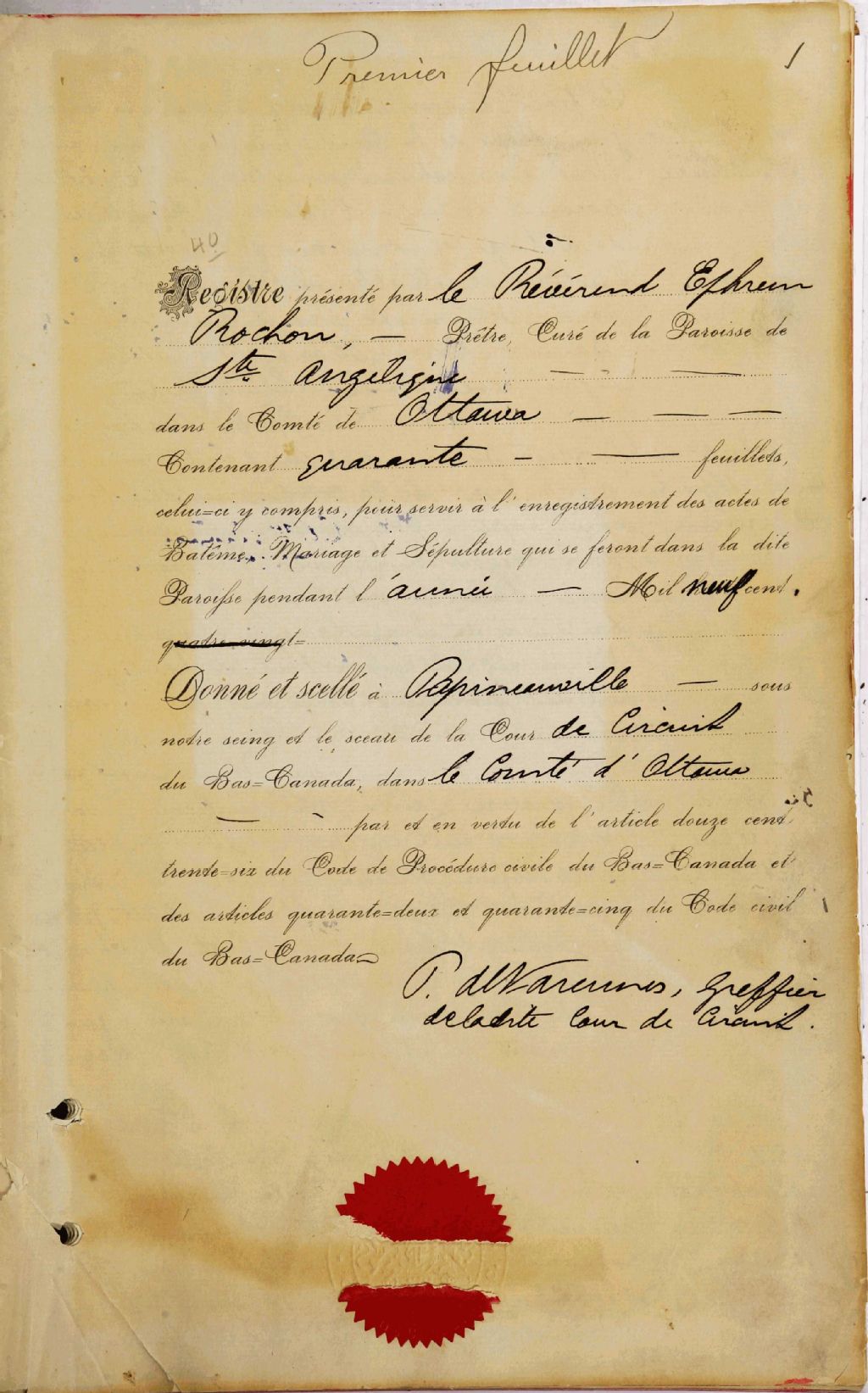 Sainte-Angélique, 1899-1921, Archives nationales à Gatineau, Fonds Cour supérieure. District judiciaire de Hull. État civil, (07H,CE701,S9).