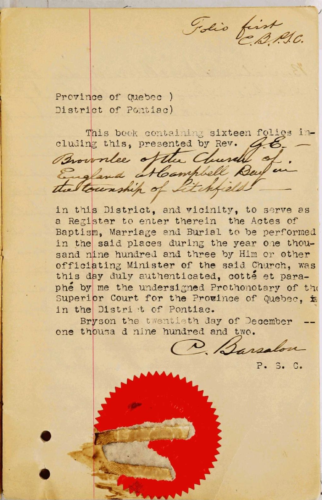Saint George's Church of England at Campbell's Bay, 1903-1921, Archives nationales à Gatineau, Fonds Cour supérieure. District judiciaire de Pontiac. État civil, (07H,CE702,S13).