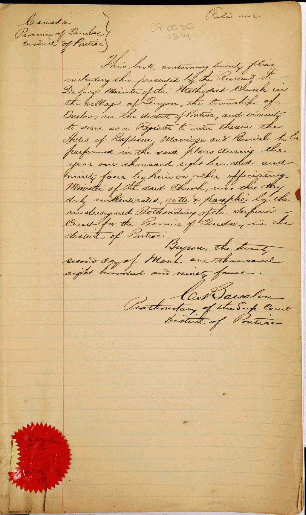Quyon Methodist Church, 1894-1909, 1911-1921, Archives nationales à Gatineau, Fonds Cour supérieure. District judiciaire de Pontiac. État civil, (07H,CE702,S24).