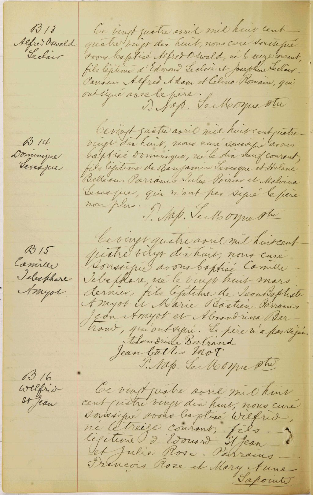 Incluant les entrées pour la mission/paroisse Saint-Antoine-de-Padoue de Bois-Francs, cantons de Mansfield et Pontefract.Curés : T. Napoléon LeMoyne (1894-1900), A.M. Renaud (1900-1907), J. Cam. Dagenais (1909)