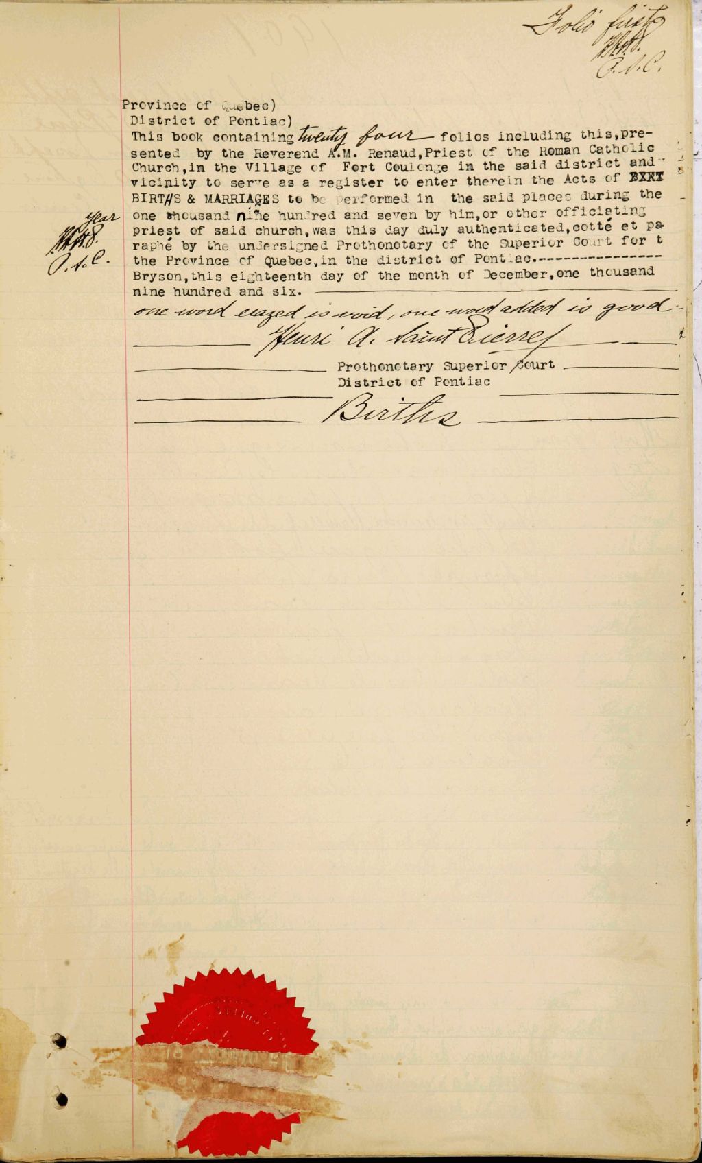 Saint-Pierre-de-Fort-Coulonge, 1894-1921, Archives nationales à Gatineau, Fonds Cour supérieure. District judiciaire de Pontiac. État civil, (07H,CE702,S3).