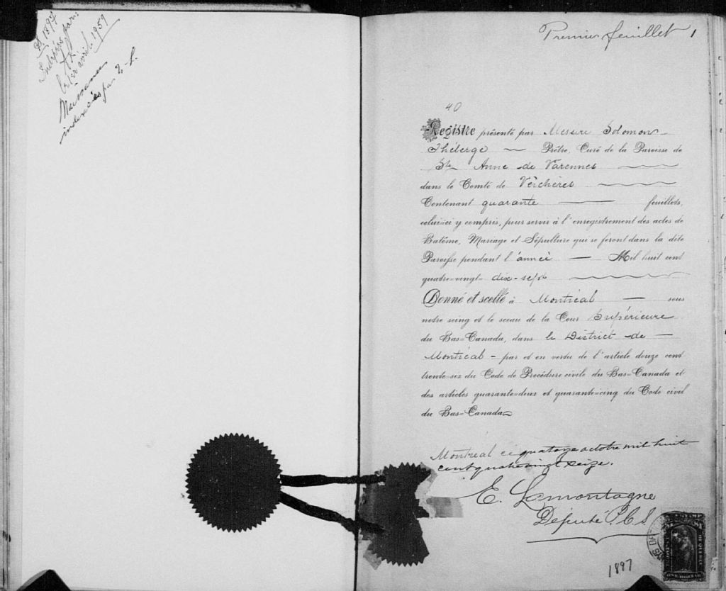 Sainte-Anne-de-Varennes, 1693-1922, Archives nationales à Montréal, Fonds Cour supérieure. District judiciaire de Montréal. État civil, (06M,CE601,S10).