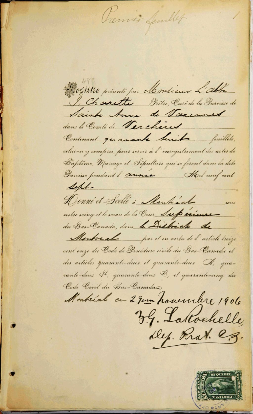 Sainte-Anne-de-Varennes, 1693-1922, Archives nationales à Montréal, Fonds Cour supérieure. District judiciaire de Montréal. État civil, (06M,CE601,S10).