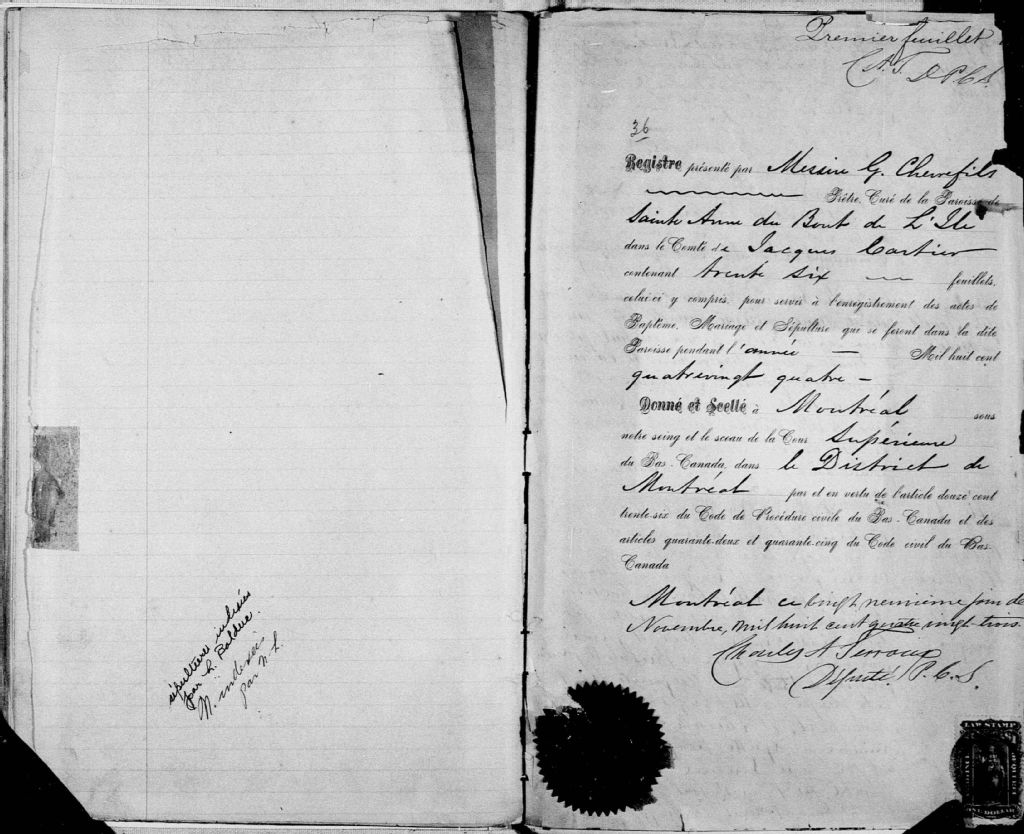Sainte-Anne-du-Bout-de-l'Île, 1703-1922, Archives nationales à Montréal, Fonds Cour supérieure. District judiciaire de Montréal. État civil, (06M,CE601,S11).