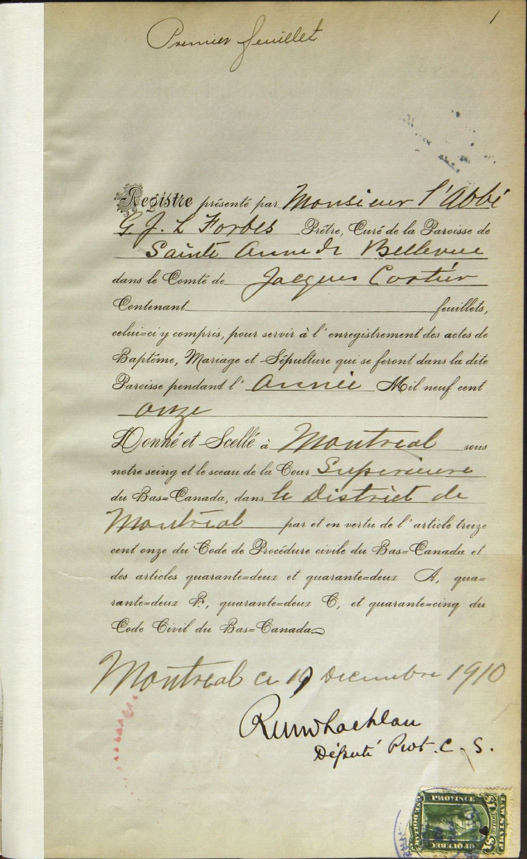 Sainte-Anne-du-Bout-de-l'Île, 1703-1922, Archives nationales à Montréal, Fonds Cour supérieure. District judiciaire de Montréal. État civil, (06M,CE601,S11).