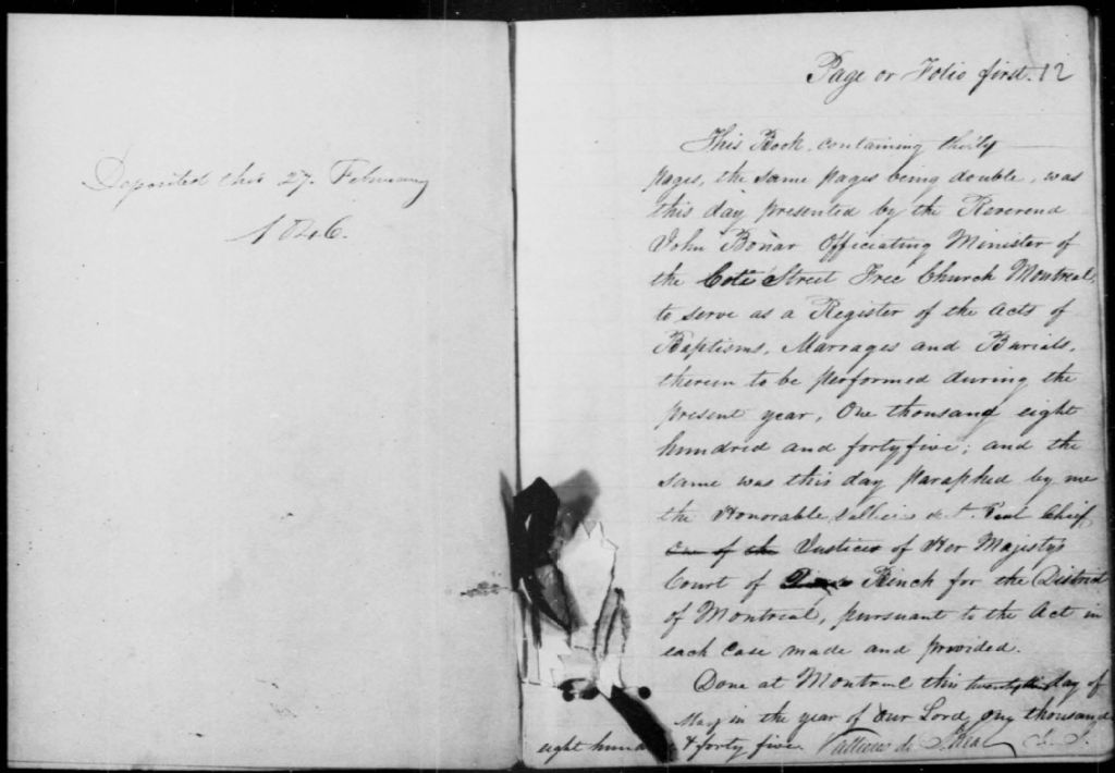 Crescent Street Presbyterian Church, 1845-1918, Archives nationales à Montréal, Fonds Cour supérieure. District judiciaire de Montréal. État civil, (06M,CE601,S120).
