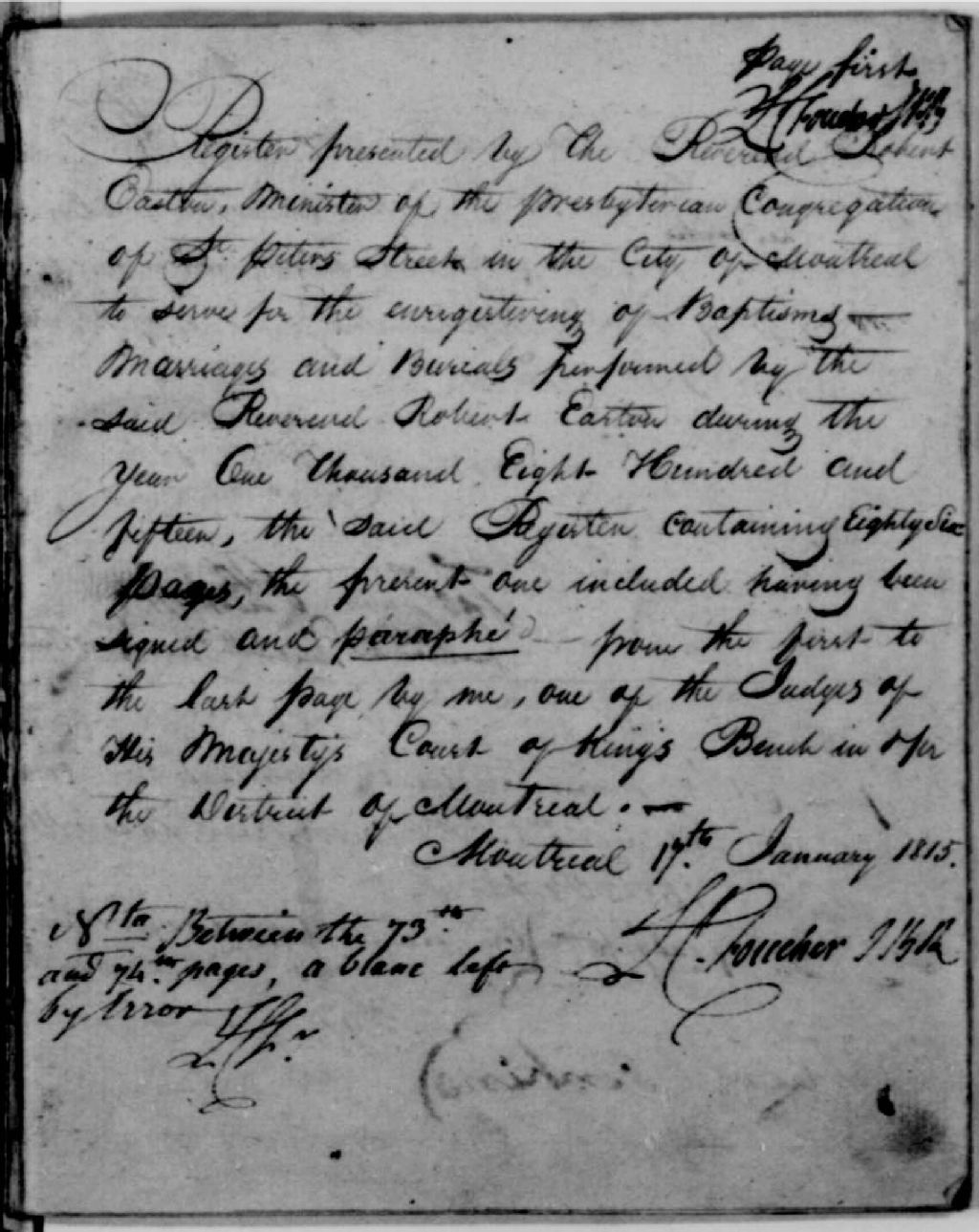 St. Andrew's Presbyterian Church of Montreal, 1815-1918, Archives nationales à Montréal, Fonds Cour supérieure. District judiciaire de Montréal. État civil, (06M,CE601,S125).