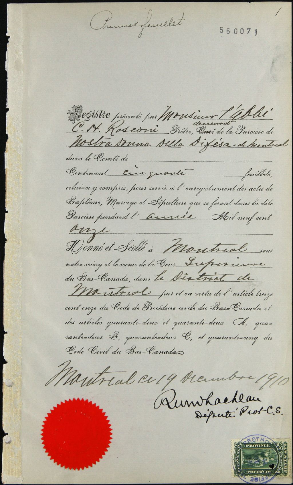 Notre-Dame-Della-Difesa, 1910-1922, Archives nationales à Montréal, Fonds Cour supérieure. District judiciaire de Montréal. État civil, (06M,CE601,S231).